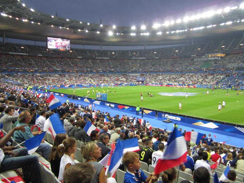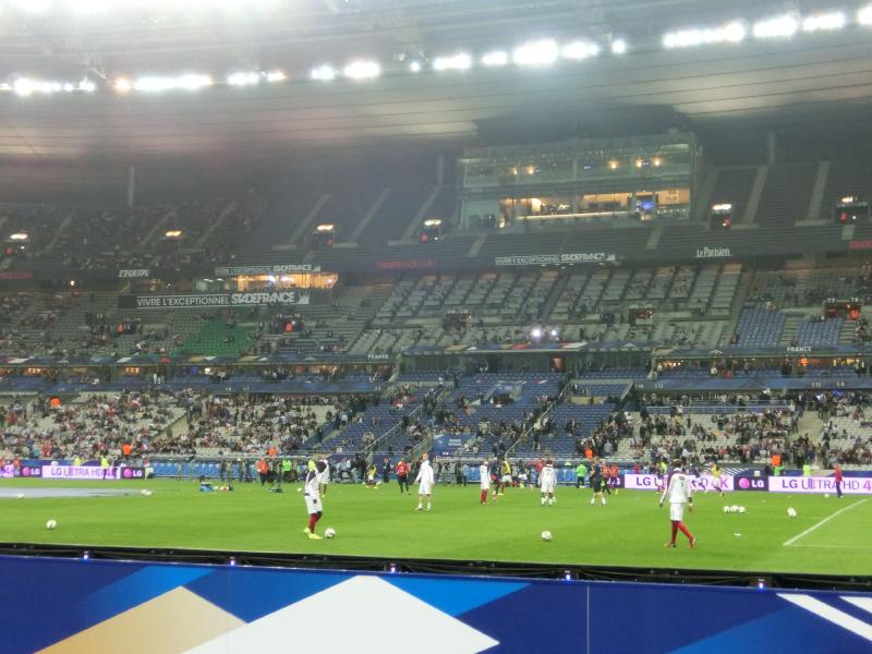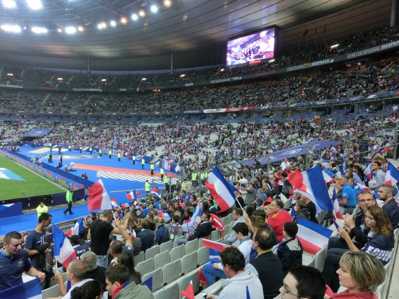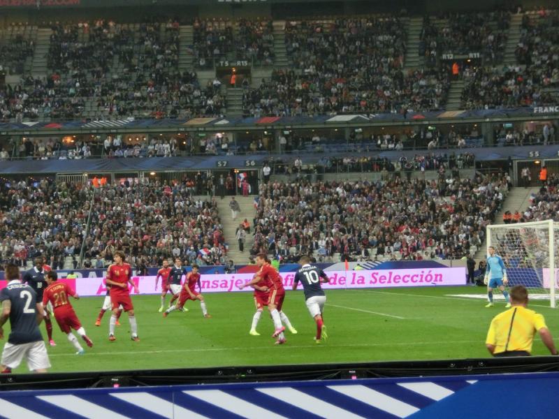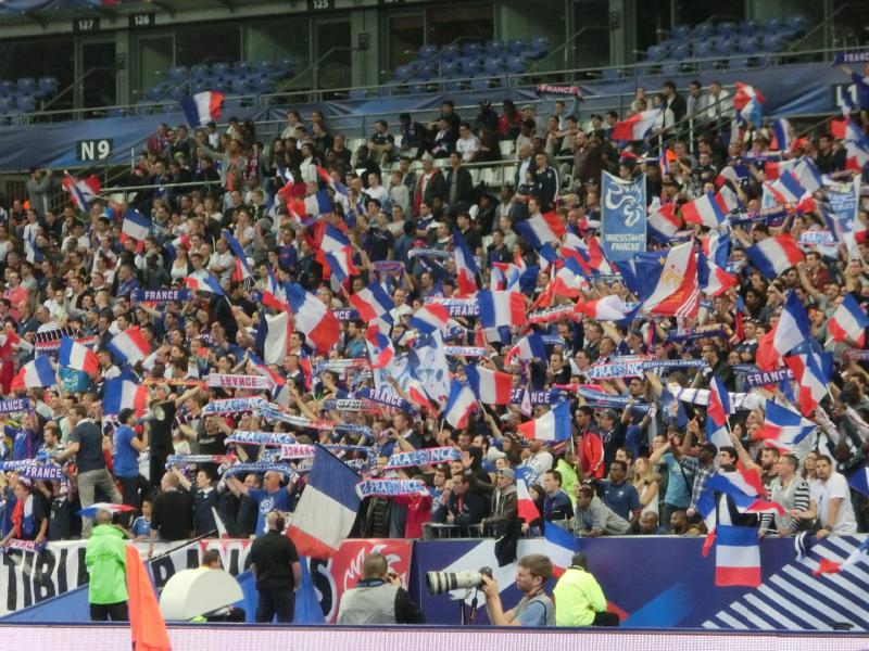 後半がスタート。開始間もない49分に、ベンゼマがゴールを決め、スタジアムが歓声に包まれたかと思ったら判定はオフサイド。途中から歓声がブーイングに変わっていきました。あとで確認したら、実はこれは審判の誤審とのことで、本当はゴールだったようです。おいおい・・・その後もフランスペースで試合は続き、73分にベンゼマからシソコ、ヴァルブエナとつながったボール中央のレミーにわたり、そのままダイレクトでシュート。ゴールの左隅に突き刺さった。その瞬間、スタジアムは割れんばかりの歓声に包まれた。今度こそゴールで、無数のフランス国旗が振られている。なんとも壮観な眺めだな。