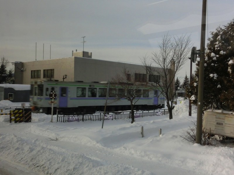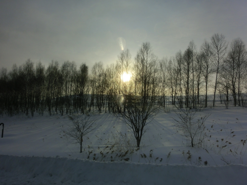 美術館を後にし、富良野市街を走っていると、ちょうど富良野線の一両編成の列車が走っていきました。なかなかないタイミングだったかもね。街を離れてしばらくすると、美瑛の丘陵地帯が広がっている。夏ならば畑がパッチワークのように見えるのだが、今は一面の雪原。そんな中、所々に木が立っている。一列に並んでいるものや、一本だけで立っているものなど、これも美瑛の風景の一つだ。そんな美瑛を抜け、あとは網走までひたすら走る。途中休憩を2箇所挟みながら、雪原の中を走っていく。