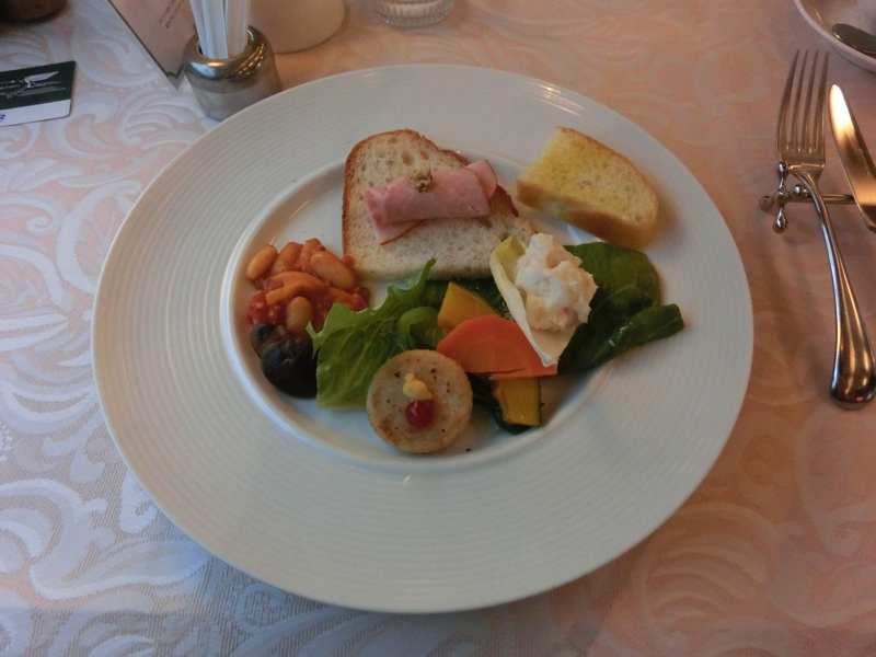 外が明るくなってきた。7時をすぎ、しばらくして朝ごはんのアナウンスが入る。早速食堂車へと向かおう。各テーブルには朝ごはんの準備がされていて、案内された席に着く。まずは食前のドリンク、これはワインビネガーにオレンジジュース、あとはオレンジやレモンなどの果物が入っている。さっぱりすっきりで、目覚めにはちょうどいい。先付けには豆のサラダにカポナータ、エビとアボカドのカクテル。朝だがシャンパンでもいただきたくなりますね。洋風なものとともに中華粥があり、これと半熟卵がいい感じで合わせることができる。次に運ばれてきたのは温かい系で、豆とベーコンとのトマト煮や焼き野菜に茹で野菜、ポテトサラダやハム、そしてチキンナゲットなど。いろんな種類がいただけて栄養満点だ。デザートにはメロンとパイナップルにフロマージュブラン、すっきりとおいしいです。列車は途中洞爺に泊まり、まさに一面の雪景色。やっぱり北海道はすごいなあ。