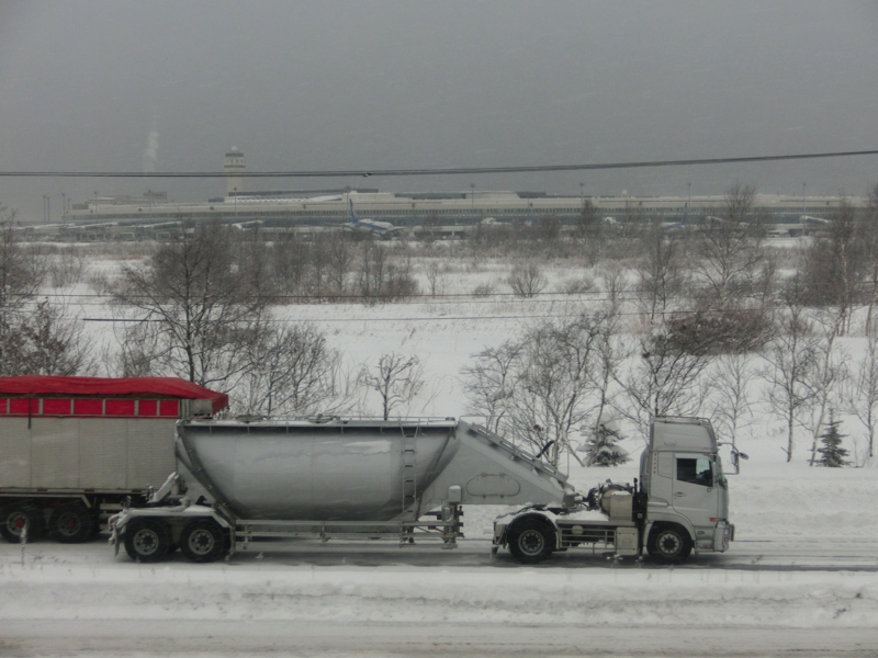 部屋に戻り、もうしばらくゆっくりしよう。車窓に流れる風景は、まさに一面の雪景色。途中東室蘭、苫小牧と停まり、そして南千歳までやってきた。雪に覆われた道の向こうには新千歳空港があり、たくさんの飛行機が見えている。こんな雪の中でも無事に離着陸できるなんてすごいことですね。そろそろ札幌が近づいてきたので、荷物をまとめよう。一泊だけだったが快適に過ごすことができたな。もうトワイライトエクスプレスに乗ることはないと思われるので、到着まで十分味わっておきましょう。