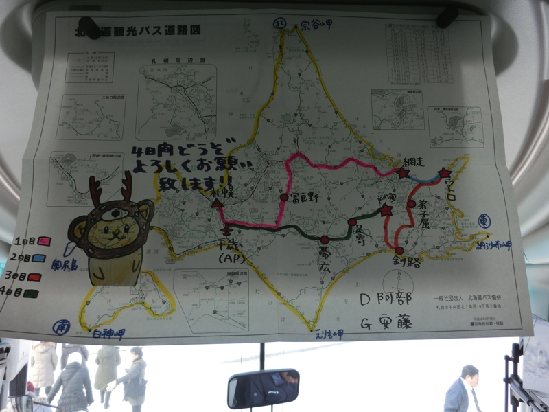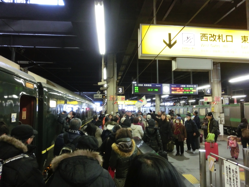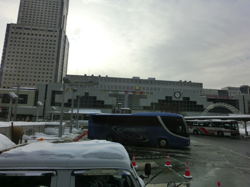 予定よりは15分程度遅れているようだが、10時すぎに無事に札幌駅に到着。名残惜しいが部屋を出て、ホームへと降りるととにかく寒い。最近大阪も寒い日が続いていたが、やっぱり北海道はレベルが違う。ホームには添乗員さんが待っていて、まずは改札を出る。そこでこのツアーに参加した人たちが一旦集まるのだが、バス3台に分乗とのこと。随分大人数のツアーだな。トワイライトエクスプレスに乗れたことで、旅の半分は目的を達成しているのだが、このあと道東方面を回るので天気がよくなればいいな。