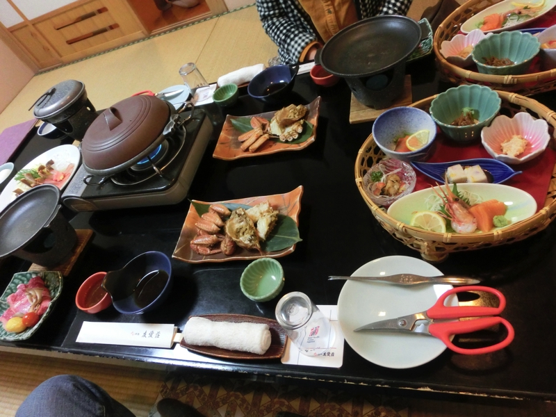 もうすっかり外は暗い。ほとんど灯りのない中を走るバスは、網走市内に入ると高台に向けて登っていき、そして今日のホテル、かに本陣友愛荘に到着。お疲れさまでした。1台しかないエレベーターで各自部屋へと入りほっと一息。もう7時をすぎているのでお風呂は明日朝に入るとして、ごはんへと行きますか。