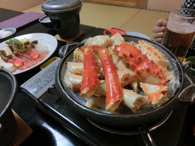 昨日のトワイライトからずっと移動していたようなものなので、ようやくゆったりとできる。さて、まずは刺身などの小鉢類をいただく。やっぱり北海道のエビはうまいなあ。次はしばし、毛ガニと戦おう。身がしっかりと詰まったいるので残さずしっかりいただく。新鮮なのでミソもうまい。次はそろそろ酒蒸しができた頃。身が甘くなっていて、これもうまいなあ。ビールが進みます。蟹しゃぶはぷりっとした身がおいしい。かに3種類を堪能した頃、天ぷらが登場。ここには蟹の天ぷらがあり、火の通った蟹ってやっぱり甘くなっておいしいなあ。蟹を堪能した後は、網走和牛。昼に続いての和牛続きだが、柔らかいお肉でおいしかったです。最後は締め、やっぱり蟹雑炊。蟹しゃぶの鍋でエキスをたっぷりすったごはんが実に美味、満腹だ。北海道の味覚、満喫しました。さあ、明日からの道東を巡る旅、楽しみだな。