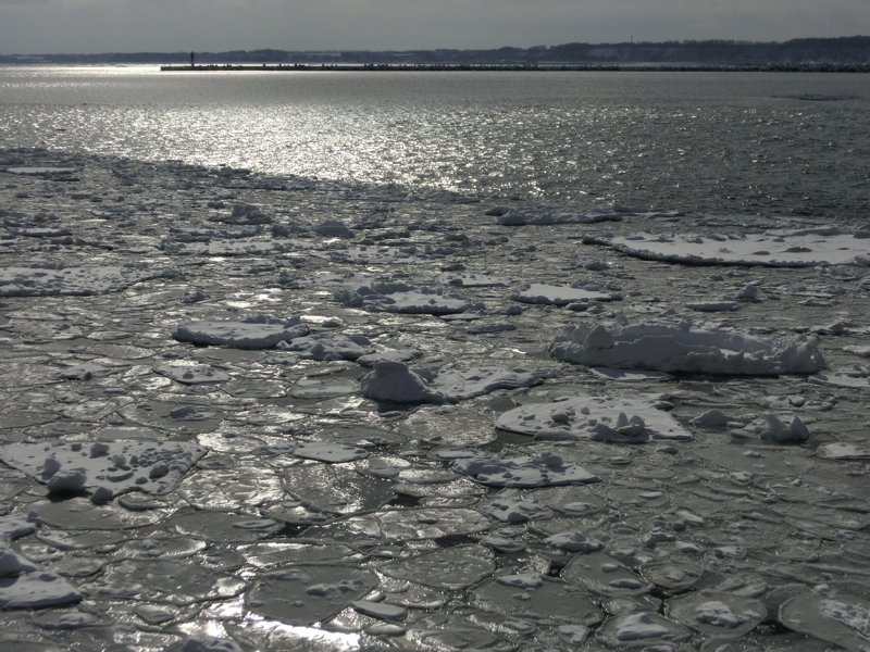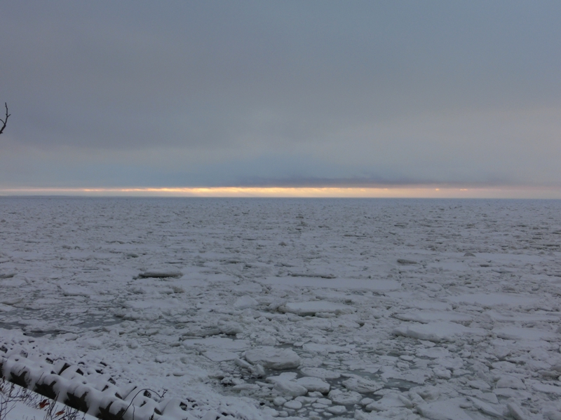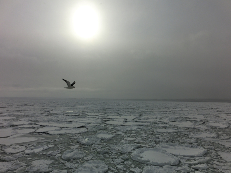 最初は薄い氷の集まりだが、しばらく進むとかなり大きな白い氷の固まりが見えるようになってきた。その氷の中を力強く進む船、迫力満点です。これはすばらしい景色だな。なかなかこの時期にここまでの流氷は見えないらしく、今回の旅は本当にラッキーが続く旅だ。やっぱり日頃の行いかあ・・沖合に出ると、もう水平線全体が流氷に見えるようになっている。これはすばらしい。氷の上を飛ぶカモメもいい感じだし、アザラシとかがいればいいのにな、クリオネはこの下にいるのかな、など思いながらこの季節限定の景色を楽しむ。しばらくすると、次第に曇ってきて太陽が見えなくなってきた。そして流氷の帯が途切れるあたりまで来ると、デッキにいるとかなり寒く感じるようになってきた。ここで船は方向転換し、港へと戻る。
