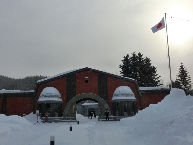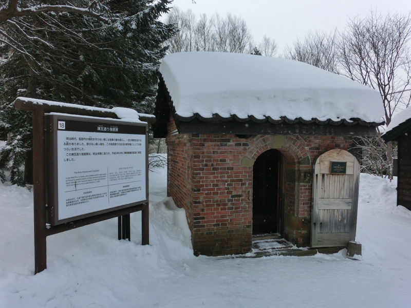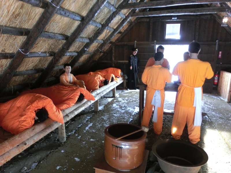 出発だ。うっすらとした曇り空からは太陽の光がのぞいていて、雪は降っているもののそれほど寒くなく、今の感じであれば船も問題なさそうだ。まずは網走監獄博物館へ。本来ここが80分あるのだが、船の時間を13時から11時に早めることになったので60分となった。博物館はオープンエリアの中に当時の建物を再現しているので、雪道の中を係の方の説明を受けながら歩いていく。これも吹雪の中だとちょっと厳しいかもね。このくらいの雪であれば、ちょうど雰囲気もあっていい感じです。正門をくぐり、庁舎前を通って職員官舎へ。看守の住んでいたところで、寒かっただろうなあ。その先には休泊所があり、囚人が道路開削の際に過ごした宿舎を模したもの。狭いところに詰め込まれるようになっていて、食事やトイレも同じ部屋の中。厳しい環境で、昔は囚人が人間扱いされていなかったのがよく分かる。