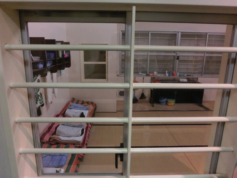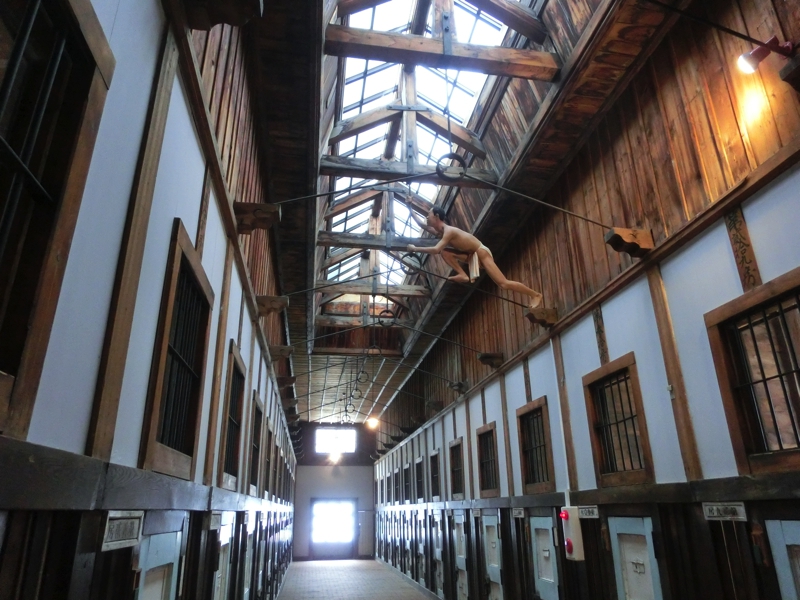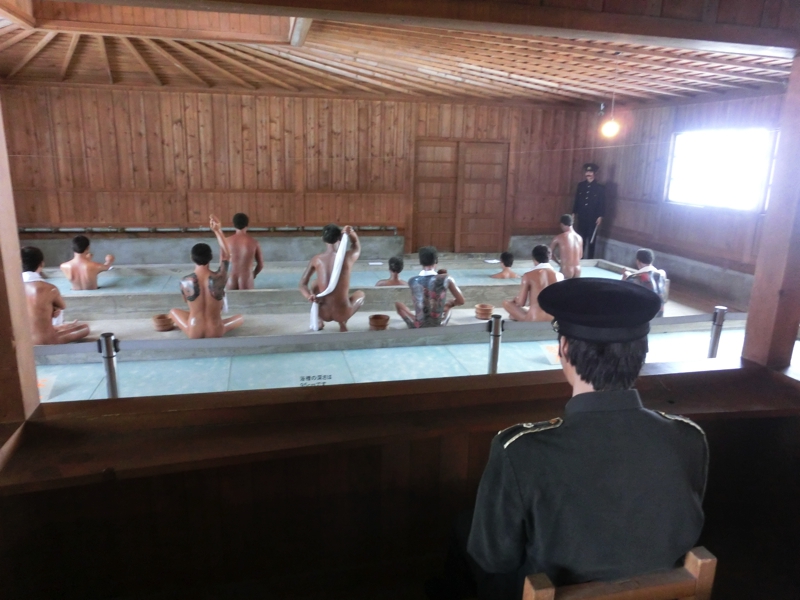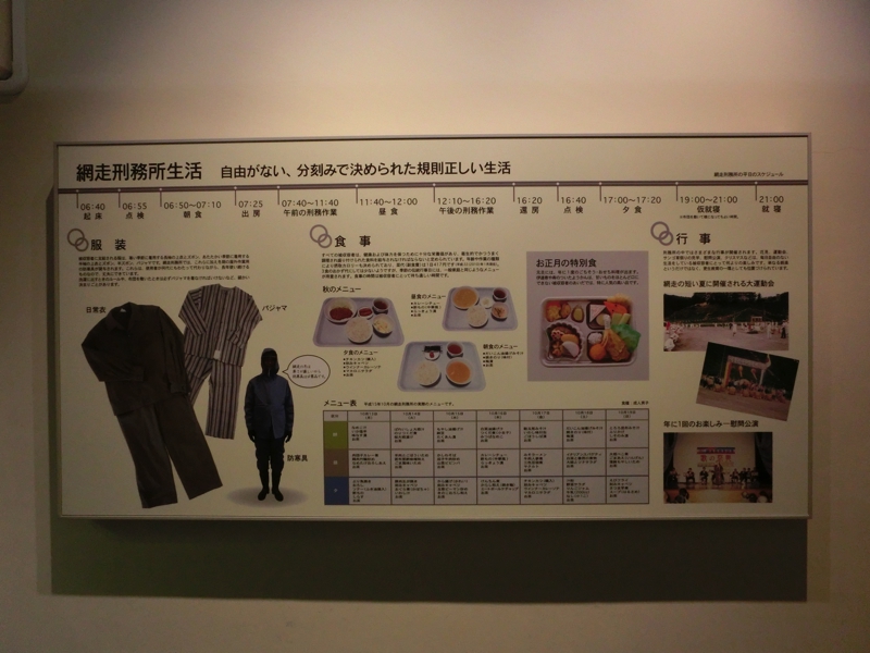 歴史館を出て、次は五翼放射状平屋舎房。中央で監視ができるよう、5つの方向にのびた収監所だ。数名が入る部屋もあれば独居房もあり、監視しやすいよう斜めの格子になっているとか、ここから脱走を成功させた囚人がかつて一人だけいたとか、様々なエピソードの説明をいただきました。その次は浴場。決まった時間で入らなければならず、監視のもとに入浴していたとのこと。とはいえ、数少ない憩いのときだったかもしれないね。そして規則違反をした囚人が入れられる独立型の独居房。ここは光も入らず、相当厳しいところだったらしい。さて、駆け足で巡った網走監獄、そろそろ時間。10時40分の予定通りに、ここを出発し、網走港へと向かう。歴史館を出てしばらくすると、左手に現在の網走刑務所が見える。当時よりは随分改善された中で、多くの受刑者がいるそうです。お世話になることはないと思うが・・