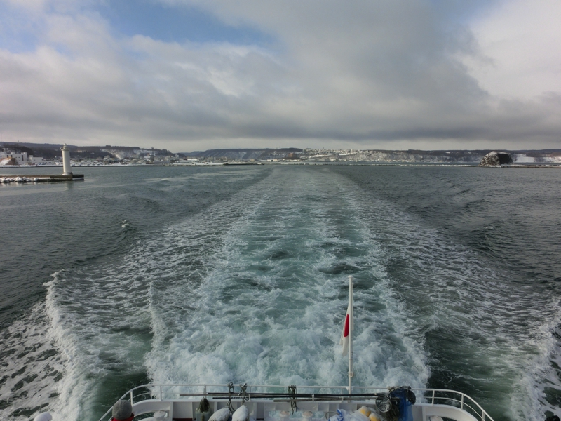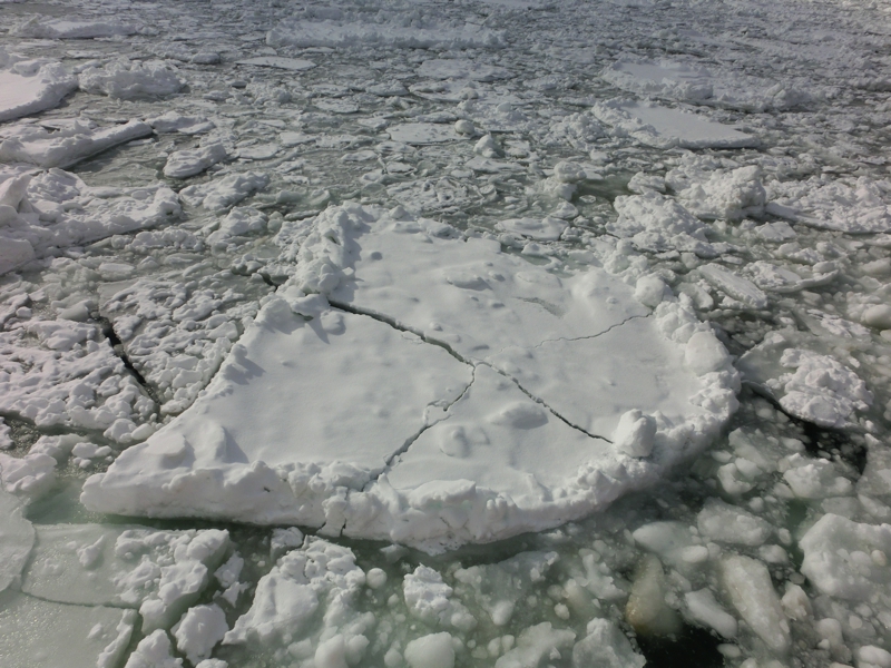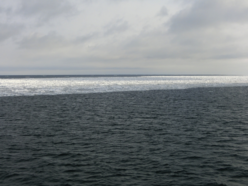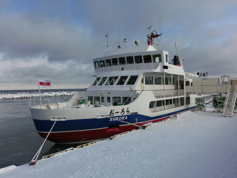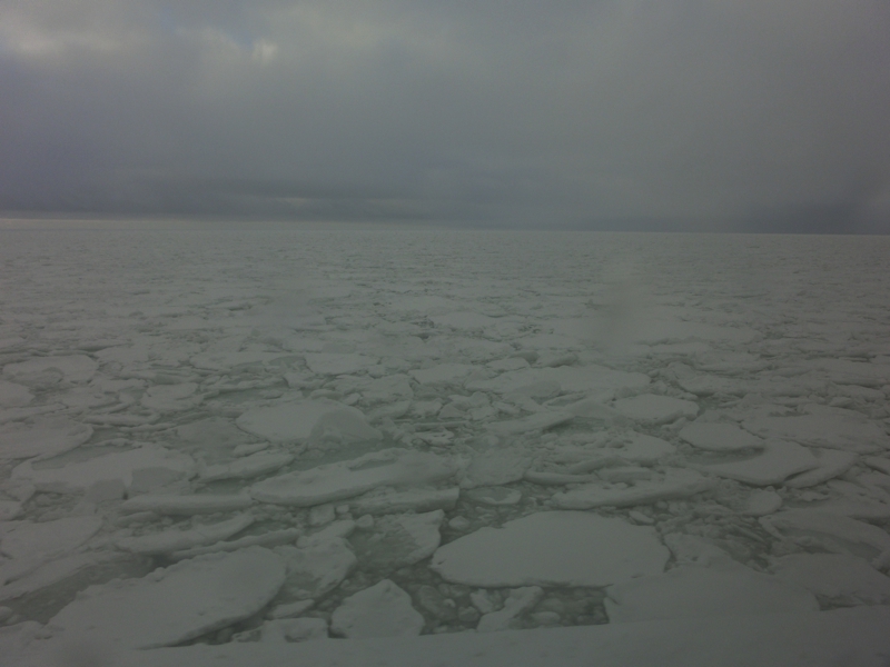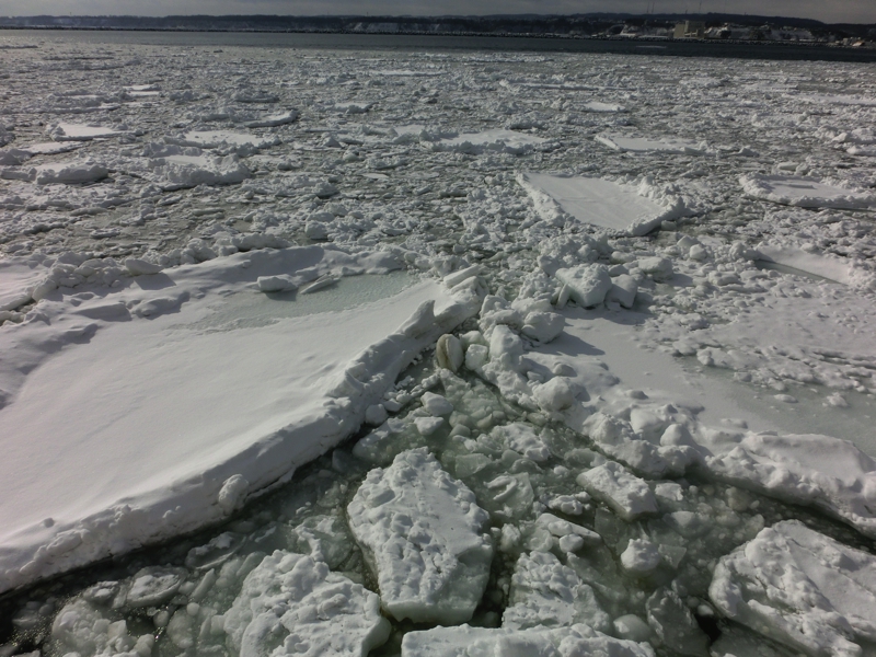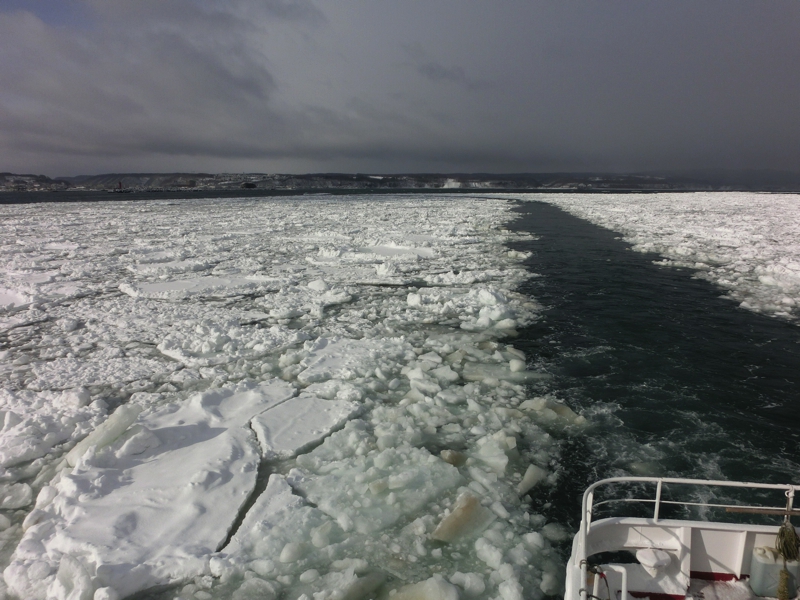 お天気はなんとなく朝よりも晴れ間が見えてきたようで、今日の天気予報から考えるとかなりラッキーな状態だ。午後には崩れる予報なので、少しでも条件のいいときに乗れそうだ。港に着くと、間もなく出発の11時で、我々の到着を待ってもらっているようだ。さっそく中に乗り込み、流氷がよく見えるよう、展望デッキへと行こう。港には特に流氷があるわけではないが、沖に目をやると白い帯のように見える。あの辺りが流氷なのかな。なにせ今日から今シーズンの流氷クルーズが始まるとのことで、例年よりも早く流氷が来ているらしい。楽しみだな。船は間もなく出発し、沖へ向かって走る。天気もよくなってきて、ほほに感じる太陽が暖かい。こんなデッキの上だが、意外と寒さには耐えられそうだ。10分くらい進んだだろうか、目の前に流氷の帯が見えてきた。