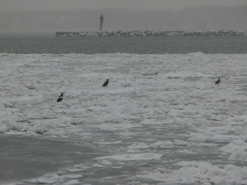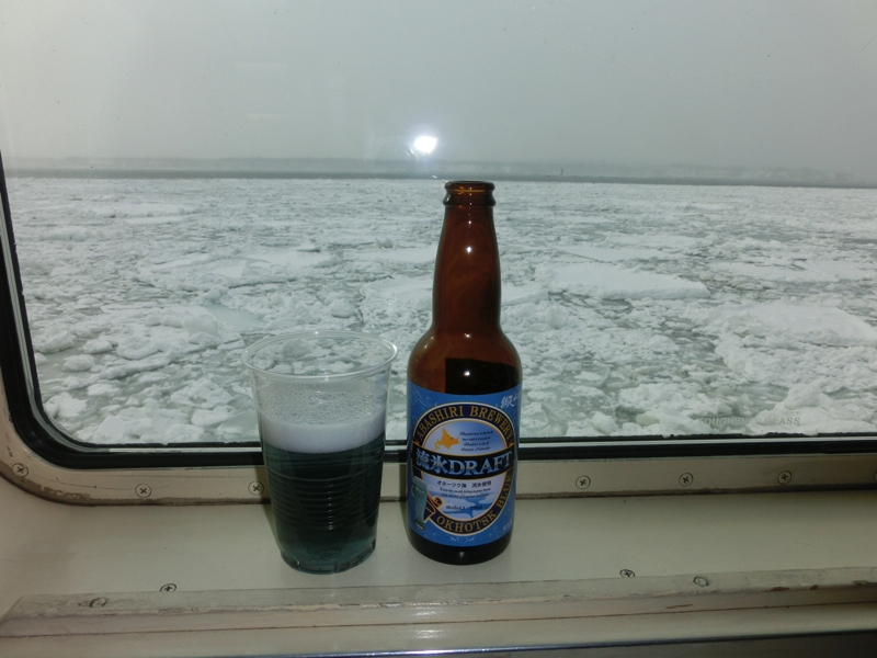 しばらくするとさすがに寒くなってきたので船内に入る。中からでもよく見えるところもあるので、せっかくなので流氷入りの地ビールをいただきながら見ることにしよう。と、なにかが氷の上にいるのが見えた。あればオオワシだな。白い線の入った鷲が、3羽流氷の上でたたずんでいる。厳しい環境の中、力強く生きている命がすばらしいです。そんな生き物たちの様子も見ながら、船は網走港まで戻ってきた。出航のときはかなり暖かかったのに、今の網走港は吹雪の中。これは寒いぞ。急いでバスに入ろう。これは当初の予定だと今から1時間後の船だったわけで、とても同じようには景色が楽しめなかっただろうなあ。天気を判断した添乗員さんのファインプレーだな。ありがたいことです。