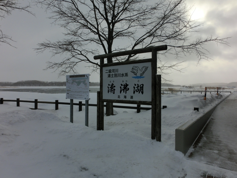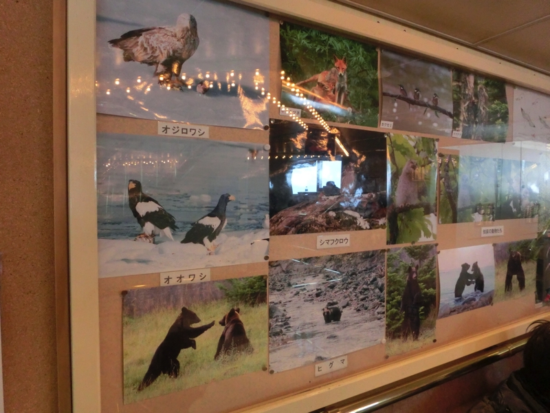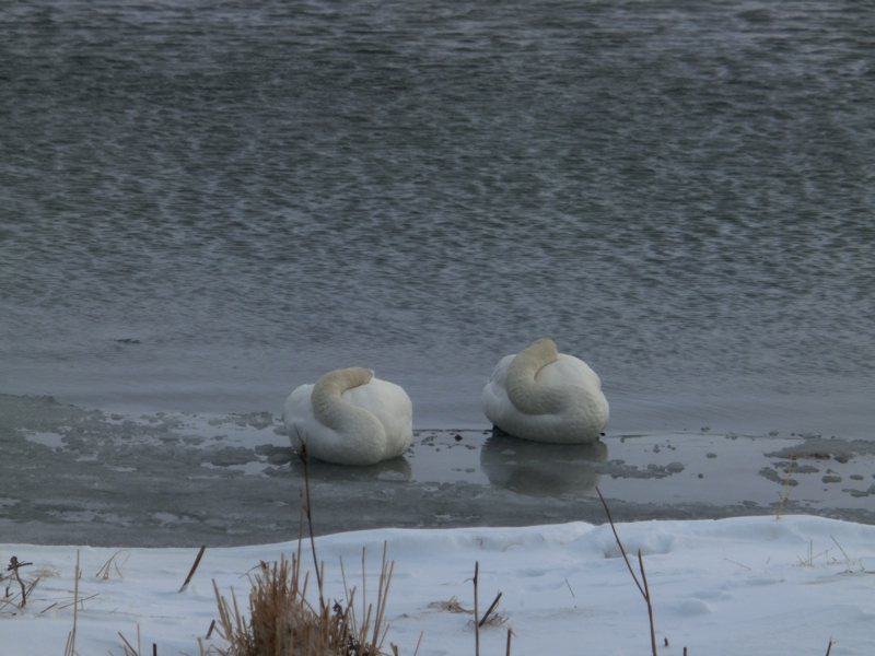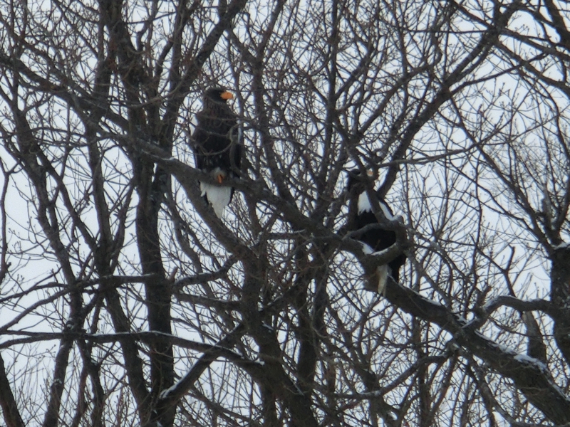 ここまでの予定が早めに終わったために、本来であればこの後すぐに知床方面に向かうのだが、途中にある湖に立ち寄ることになった。そしてその濤沸湖という湖に着く頃には、天気も落ち着いてきたようだ。湖にはたくさんの白鳥がいて、湖畔に集まっている様子がかわいいですね。湖をよく見ると少し先に陸地からつながっているように氷があり、その上になにやら動くものが。キタキツネだ!えさを探しているのか、うろうろと歩き回っている様子がかわいいな。あとは水辺で寝ている白鳥。首を後ろに曲げ、なんともいえない姿で寝ている。あれが楽なのかなあ。まだ時間があるので、近くの資料館に入ってみる。中には湖にいる生き物などの展示がいろいろあるが、奥の大きな窓際ではスタッフの方が双眼鏡を持って説明をしている。ちょっと借りてみると、遠くの林にオオワシのつがいが見えた。資料館の外でも、近くの木にとまっているオオワシを見ることができたし、北海道の冬の自然に触れることができてよかったな。