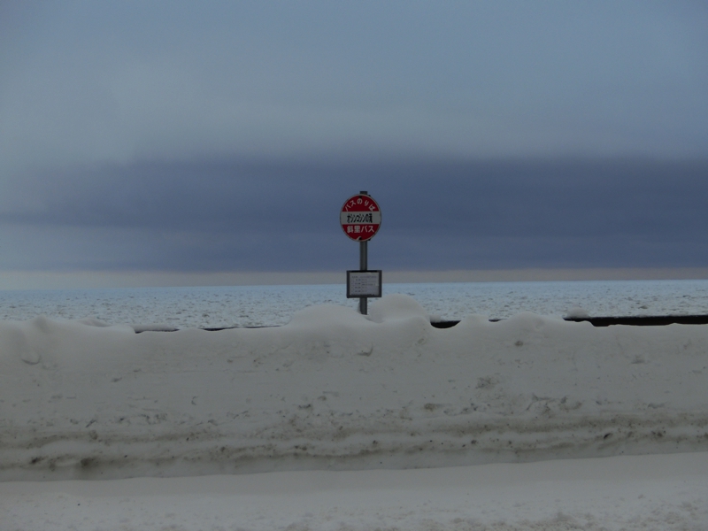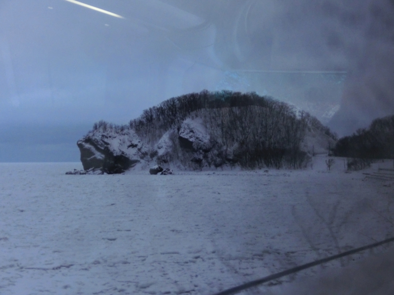 何度かうとうとしながら、しばらくして車窓に見えたのは真っ白い海。これは知床半島の北側にびっしりと広がった流氷、すごい。この時期にここまでの流氷が集まることも珍しいとのことだが、とにかくこの北海道の大自然、すばらしい景色だ。日本の自然が如何に多様かということが実感できる。さて、バスはオシンコシンの滝に到着。この名前は「川下にエゾマツが群生するところ」の意味らしい。滝は海沿いの道を少し入ったところにあるのだが、少し坂になっているところを新雪を踏みしめながら滑らないよう気をつけながら歩く。するとそこには、雪の中を流れる滝があった。水の流れ落ちる周りは少し凍っているのか、いかにも冷たそうな流れだ。時期によっては滝全体が凍っていることもあるらしく、そんな景色も幻想的。前の道からは一面に流氷が敷き詰められた海が見え、遠くの空がうっすらと赤くなっているのは日没のタイミングだからか。厳しい冬ならではの美しい景色を目に焼き付けよう。