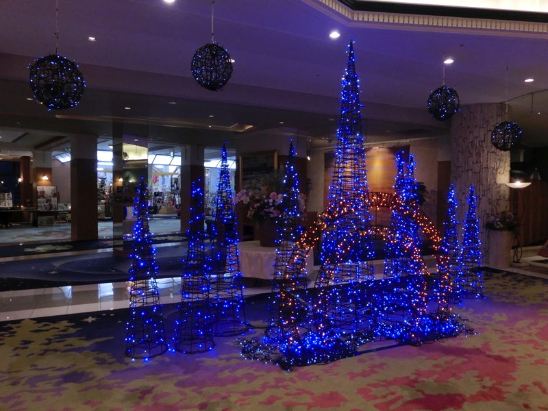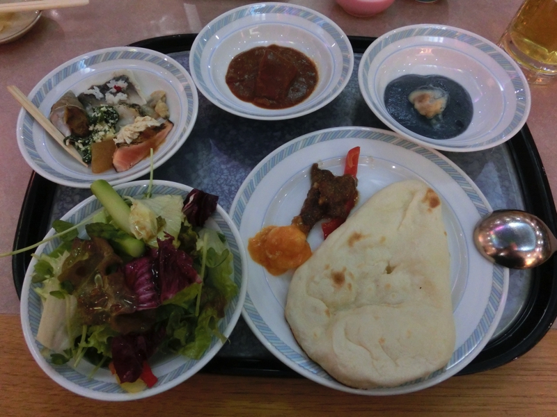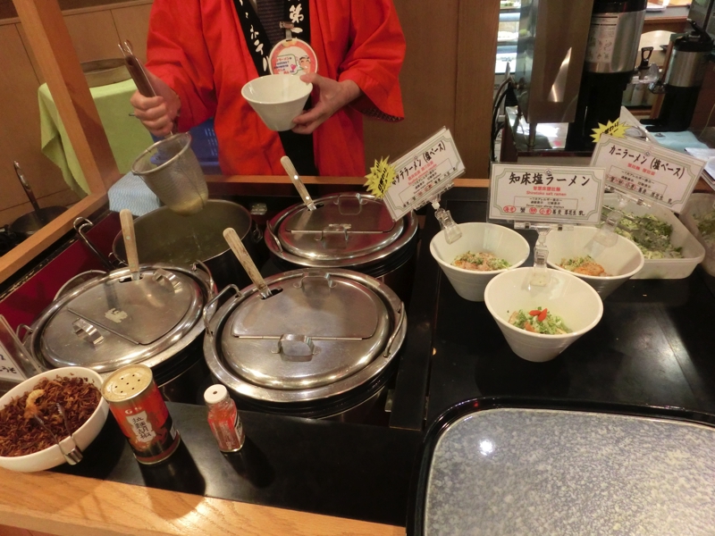 おかわりにいこう。寿司カウンターもあり、ホッキ貝やカニなどの北海道らしいものをいただく。揚げ物シリーズでは、天ぷらや鳥のザンギなど。そろそろ満腹になってきた。カレーもあるのでナンとともにいただくが、流氷カレーというのがあった。なぜか青いルーはタイカレーのような風味で、氷をイメージしているのは鶏肉。見た目からはあまり想像できないが、おいしいです。そろそろしめということで、ラーメンをいただく。カニ入りの塩ラーメンをいただき、もう満腹。デザートにフルーツをいただき、ごちそうさまでした。あとは部屋に戻ってのんびりしましょうか。