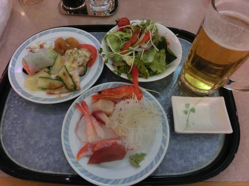 そろそろごはんの時間なので、レストランへと行こう。少し早いのでしばらくお土産屋さんを見て、レストランへ。バイキングなのだが、入り口付近にはヨーヨーつりやら綿飴やらかき氷やら、お祭りの雰囲気。奥にバイキングエリアがあり、刺身やら天ぷらやら唐揚げやら、たくさんの料理が並べられている。生ビールとともに、いろいろいただきましょう。最初は甘エビやホタテなど刺身系をいただきつつ、久しぶりの生野菜をたっぷりいただく。ちょっと野菜不足だからね。