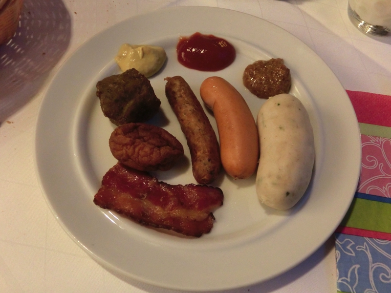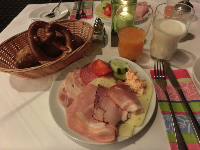 6時起床、8時前からあさごはん。ほぼこのペースで今回は来てますね。朝ごはん場所へと行くと、これはすごい。いままでにない種類の冷菜が、ところ狭しと並んでいる。ハムやチーズは定番なのでまずいただくとして、いろんな種類のクリームチーズやレバーペースト、サラミなど。せっかくなので、なるべく多くの種類をいただきましょう。パンとともにいただくが、どれもうまいです。ただ、この食生活を続けていたら明らかに塩分の過剰摂取。まあ旅行でのことだし、キュウリやトマトもたくさんいただくことで良しとしますか。温かい料理もいろんな種類のソーセージ。グリルもボイルもあるが、やっぱり白ソーセージは美味しいし、ニュルンベルガーは昨日の方が美味しかった。その土地の美味しいものがあるわけですね。ヨーグルトやキウイもいただくが、これはかなりの満腹。マーケットに行くと昼と夜が中途半端になるので、朝のしっかり栄養補給が重要だね。
