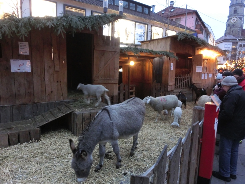 とりあえず、まずは広場近くにある市場へと向かう。Markthalleというこの場所は、どうやら100周年記念の歴史ある市場。地元の人が利用するところかな。ハムやチーズ、お惣菜や野菜など、たくさんの食料品が売っている。まあでも、ちょっとここで買えるものはないかな。市場を出ると、なぜか囲われた中に羊やロバが。これもキリスト教の決まりごとなんだろう。小さいのもいて、単純に可愛いけどね。