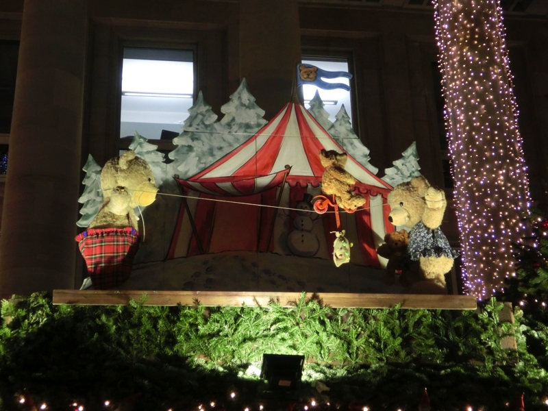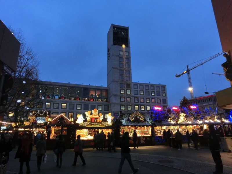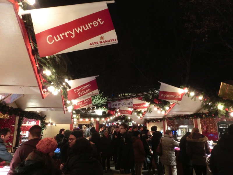 この広場では買いたいものに巡り会えなそうなので、動きますか。マルクト広場から宮殿広場の間の通りもクリスマスのお店がたくさんあり、ぶらぶら見て回る。しばらく歩くとちょっとした広場に出てきて、なんとなくこの辺りにありそうだと思ったらちょうどいい感じの飾り物を発見。クマ&ウマでいいものが買えました(6)。この広場の脇の狭い道を行くと、ピザやニョッキなど、ちょっとイタリア風の場所。その通りを抜けると、宮殿広場に来ました。