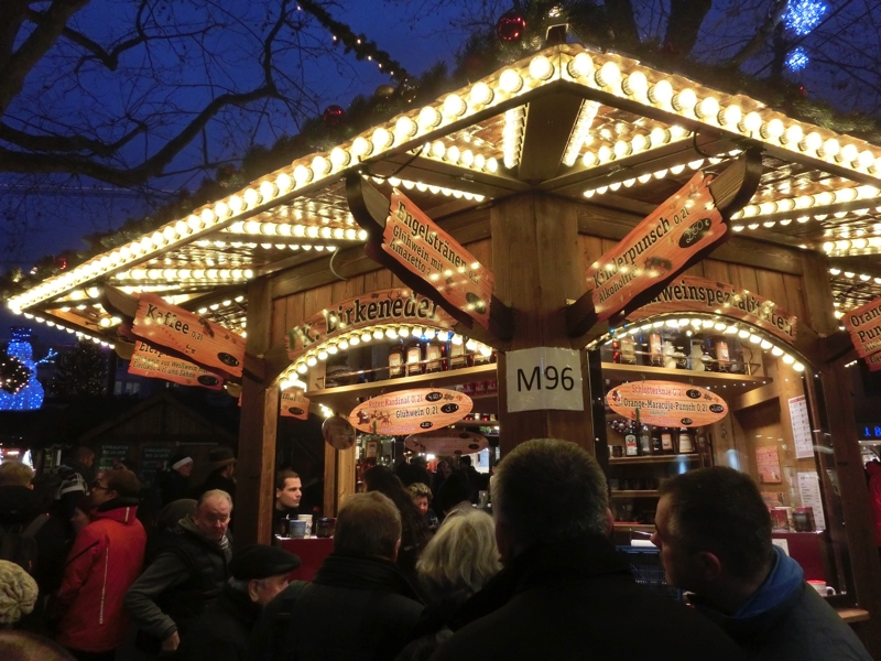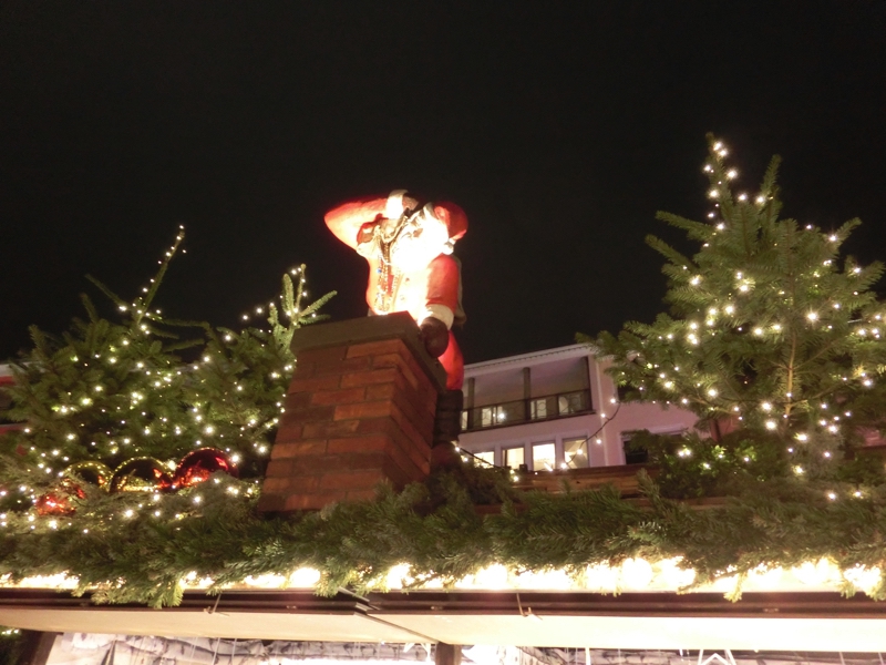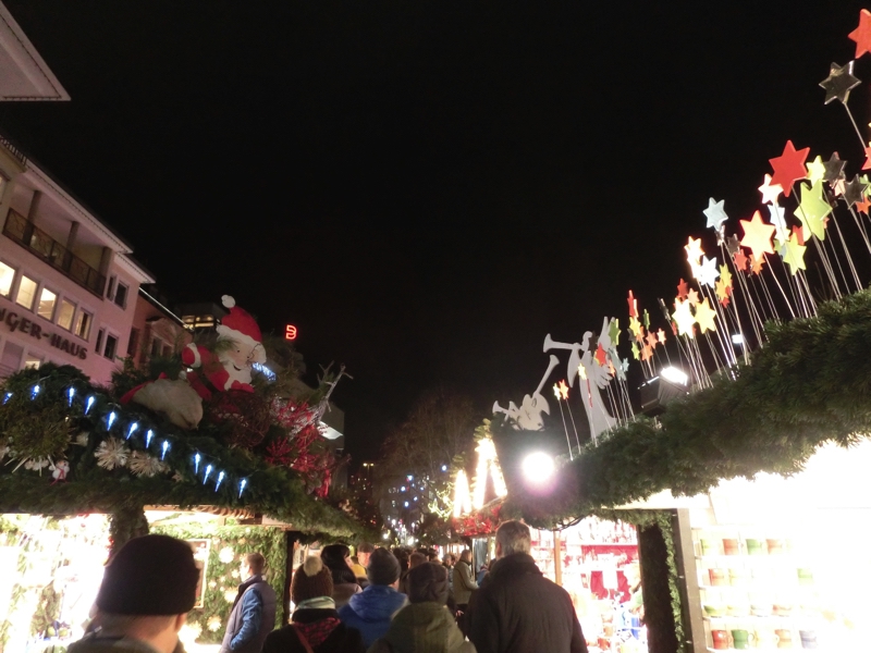 そろそろ16時。日没も近いし、出かけますか。まずは駅近くあるREWEというスーパーに行ってみる。バターを買いたいが、どうやらドイツ製は無塩が多く、ここでは有塩のがあるかどうかが今ひとつよく分からない。ドイツ語の壁だな。お土産用のチョコも見てみよう。免税店でも売っているようなものではなく、ここではプライベートブランドのちょっといい感じのがあるなあ。まあ一つの候補として、ここはこんなところで。ではクリスマスマーケットへと行きますか。ちょっと道に迷いながら、到着したのは宮殿広場。メイン会場の一つで、たくさんのお店が出ていてる。ここシュツットガルトで特徴的なのはそれぞれの店の屋根にサンタクロースやトナカイなど、まるで山車かと思うような飾り付けがされていること。そんなところも楽しめる。