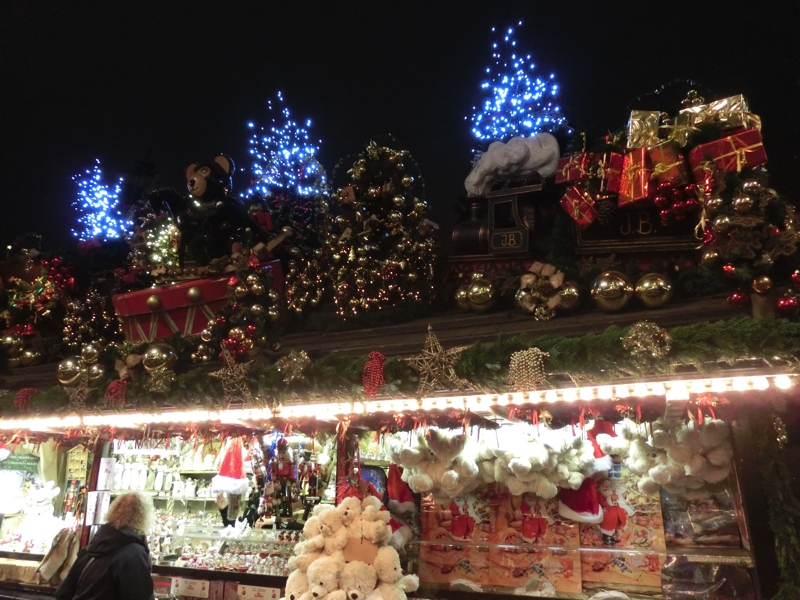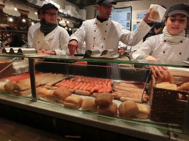ではお店を見て回りますか。ここではお店の屋根も楽しみながらの散策なので、これも楽しいな。どのお店もクリスマスの趣向を凝らしているが、単純に可愛いものもあれば宗教色の強いもの、ちょっと怖い感じのものなどいろいろある。なにか記念品を買いたいが、なかなか気にいるものがないなあ。昨日までの4箇所で買ったものとかぶらないようにすると、サンタにトナカイに雪だるまが外れるのであとはクマ系か天使系などか。さあどうしようかな。少しお腹を満たそうか。ソーセージ屋さんで、ちょっと太めのグリルソーセージをいただきましょう。パンに挟んでいただくのだが、やっぱりうまい。もはや安定のソーセージ(3)。
