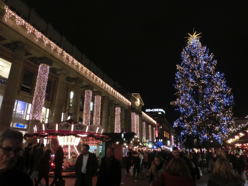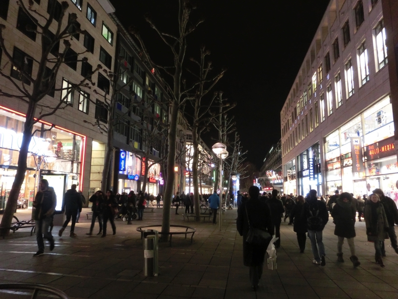 名残惜しいが、そろそろ帰りますか。この広場のイルミネーションも綺麗なので、たくさんの写真を撮りながら歩く。そして、駅につながるケーニッヒ通りに出てきた。ここは歩行者天国の広い通りで、シュツットガルトの目抜き通り。道の両側にはたくさんのお店がある。そんな中、駅に近いところでデパートを発見。地下に食料品売り場もあるようで、行ってみよう。キッチン用品が並ぶ中を抜けると、ありました食料品コーナー。肉や野菜などもあるが、ここはチョコやクッキーなどのちょっといい感じのお菓子類が充実している。ちょうどいい、ここでお土産を揃えましょう。バターもみてみる。ドイツ製の有塩のが1つだけあったのでそれと、あとはフランスやイタリア、デンマーク製でも良さそうなのを買いましょう。あとなぜかその横にはカレンダー売り場もあり、ちょうど来年のカレンダーが欲しかったのでそれもゲット。いいタイミングでいい買い物ができました(65.96)。