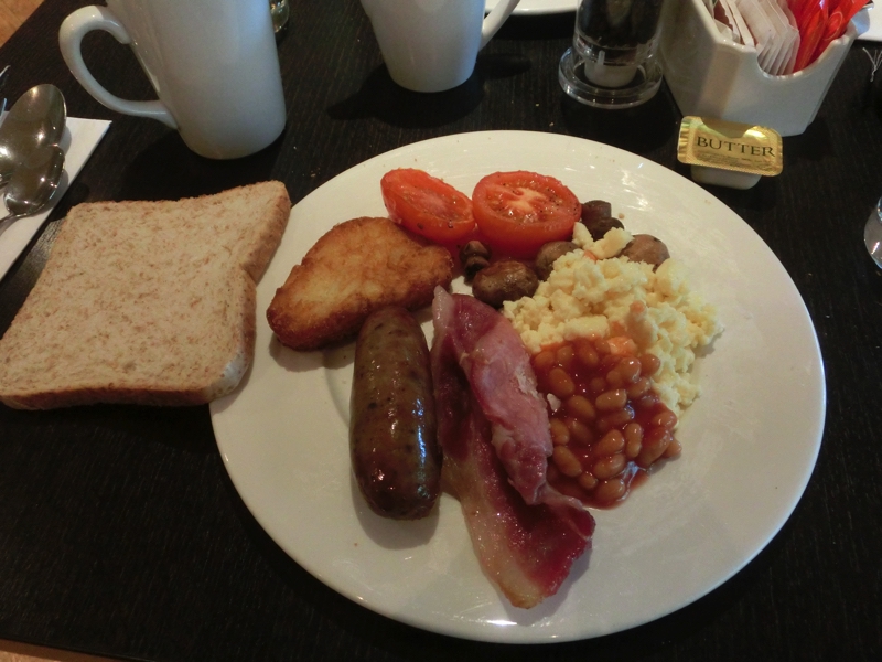 朝6時起床のつもりが、空腹で目覚める。おなかがぐーぐーなっているのは昨日の栄養不足のせいか。起きて準備をして、7時半ごろにごはんへと向かう。1階のレストランは、朝ごはんを食べにくる人で結構賑わっているな。今回の初イングリッシュブレックファーストということで、まずはジュースで体を潤す。そして最初は冷菜類。ハムやチーズ、サラミとパンをいただくのだが、久しぶりのまともな食事ということでどれもうまい。体に栄養が染み込んでいくようです。続いては温菜類、まさにど定番のものばかりだが、厚めのベーコンにマッシュルームがうまいぞ。しっかりいただき、飲み物はポットでの紅茶。ティーバックなのだが、すっきりとしたおいしい紅茶だ。イギリスの食事は朝ごはんが一番だというが、確かにしっかりいただけておいしいです。ただもう少し生野菜、特に葉物があると嬉しいのだが・・・あとは食後にヨーグルトとフルーツをいただき、ごちそうさまでした。今日はドライブもあるし、栄養補給はばっちり。