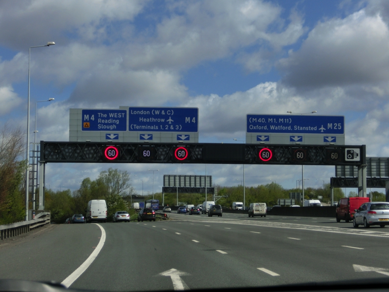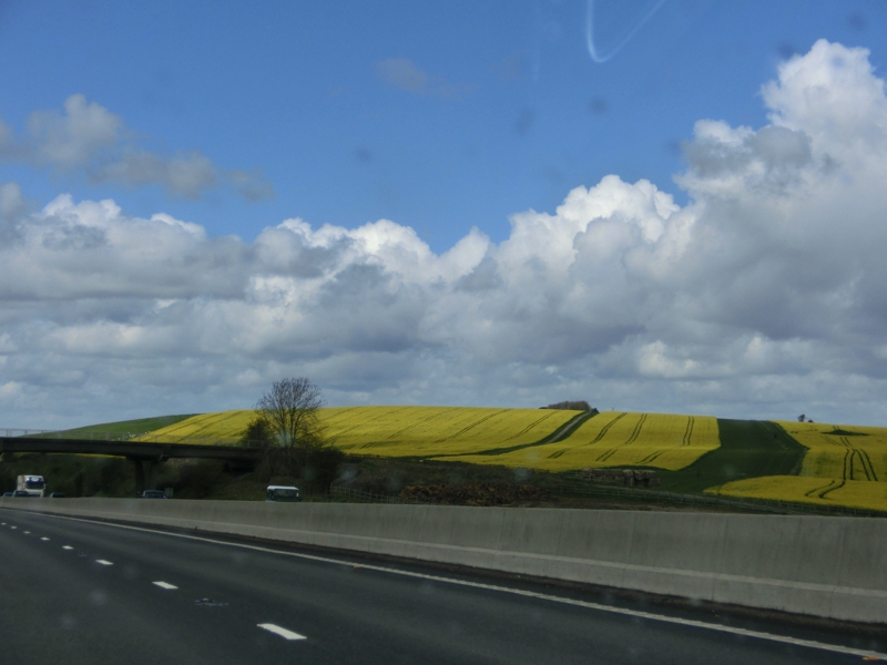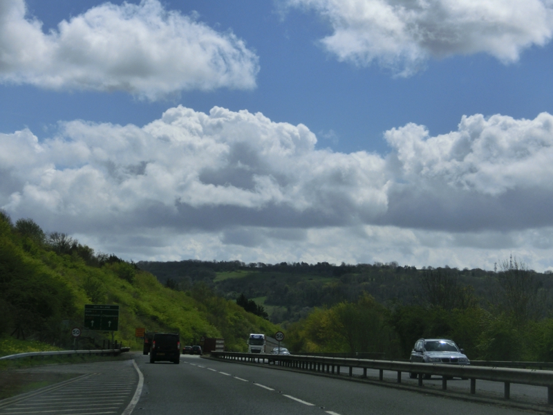 では行きますか。晴れているうちにホテルまで走りたい。しばらくは来た道を戻るのだが、やっぱり途中の景色がいい。天気予報は雨がちだったのだが、イギリスの天気は本当に変わりやすい。晴れているうちに、しっかりと楽しみましょう。高速のM4に戻ってきた。しばらくロンドンに向けて走るが、途中で北向きに分岐。ここからは再び田舎道を走る。途中のいい景色をたくさん見ながらのドライブだ。イギリスの田舎道にはほとんど信号がなく、ラウンダバウトというロータリーを行く。でもこれだとほとんど止まることがないので、結構疲れるのです。赤信号待ちもあまり多いと困るけど、適度にあるほうが休憩になることを実感。
