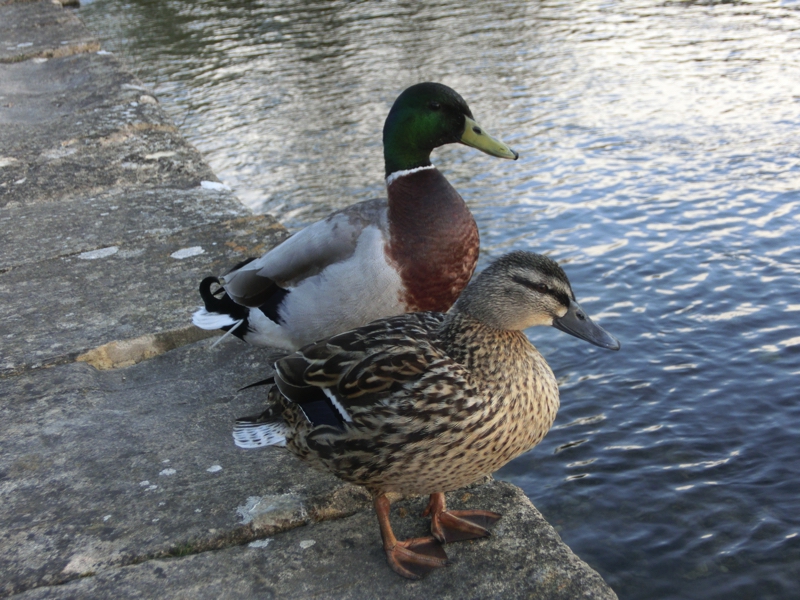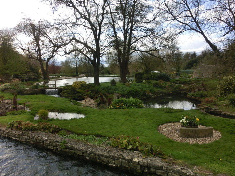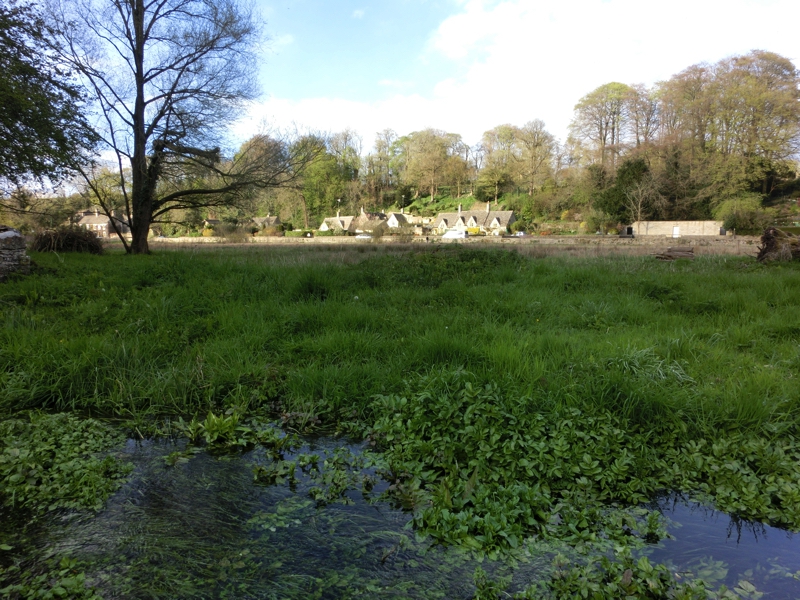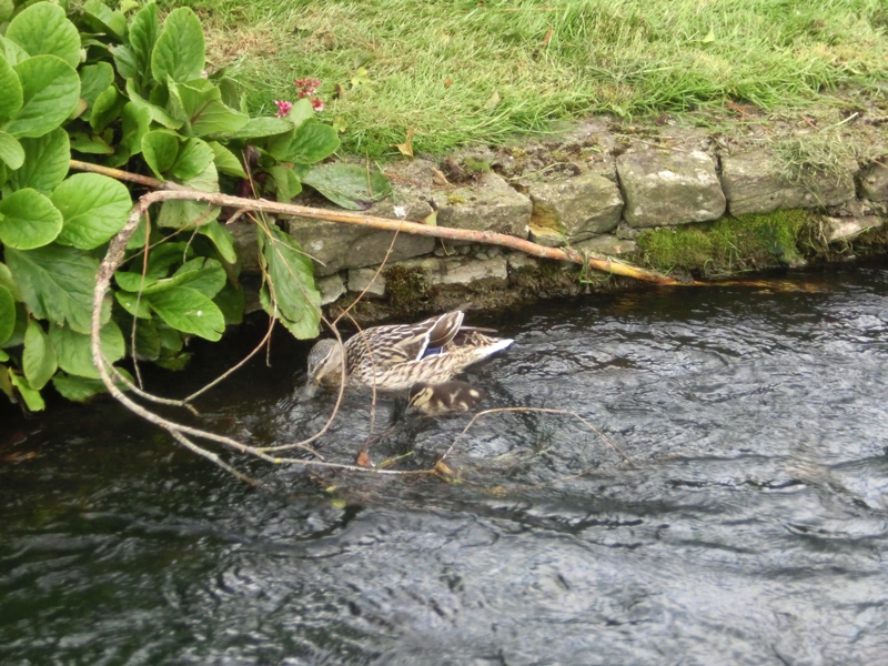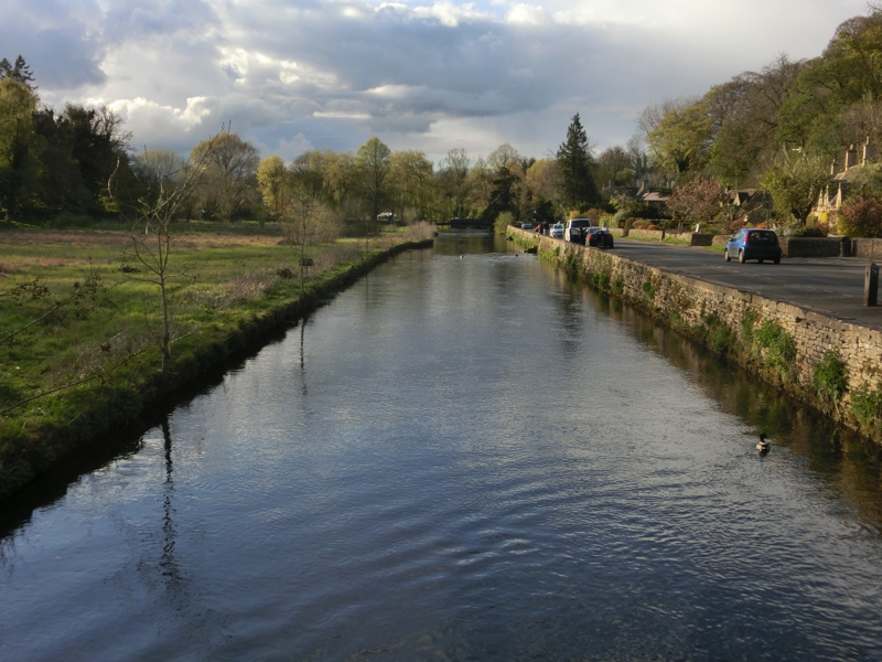 もう18時を過ぎているので、街に人はあまりいないようだ。たぶん昼間は賑わいそうだけどね。では散策に行きますか。ホテルの前にはトラウトファームがあり、ここでバイブリー名産のマスを養殖しているらしい。でも見た目は綺麗なイングリッシュガーデンだ。その前の小川にカモがいたが、よく見ると一匹のコガモがいた。ママカモから何かを教わっているようにもみえ、とてもかわいい。