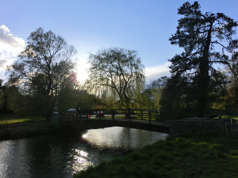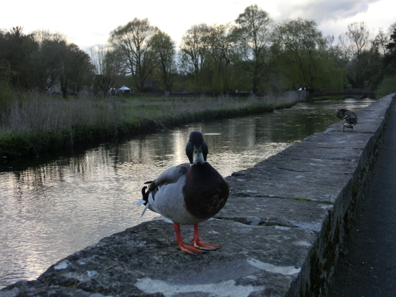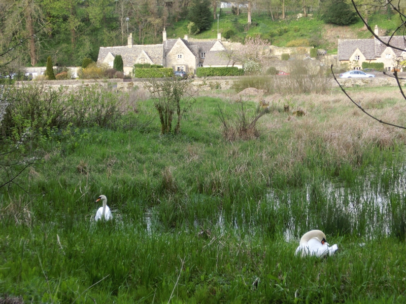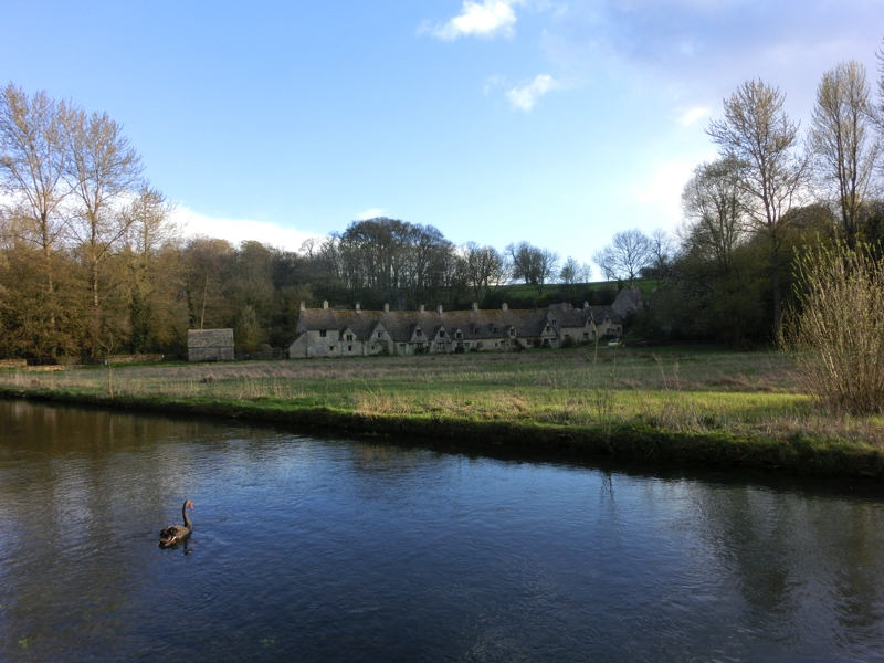 ホテルに戻りがてら、小川のところに見つけたのが黒鳥。ブラックスワンですね。つがいのカモもいるし、この小川越しに見るコッツウォルズの建物、いい景色だ。川のせせらぎを感じながら、この景色を存分に楽しみましょう。傾いてきた太陽は雲に隠れたり出たりの繰り替えしだが、やっぱり太陽がでると景色も映える。明日もいい天気になるといいな。