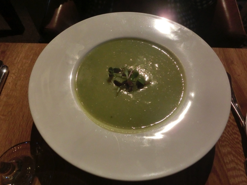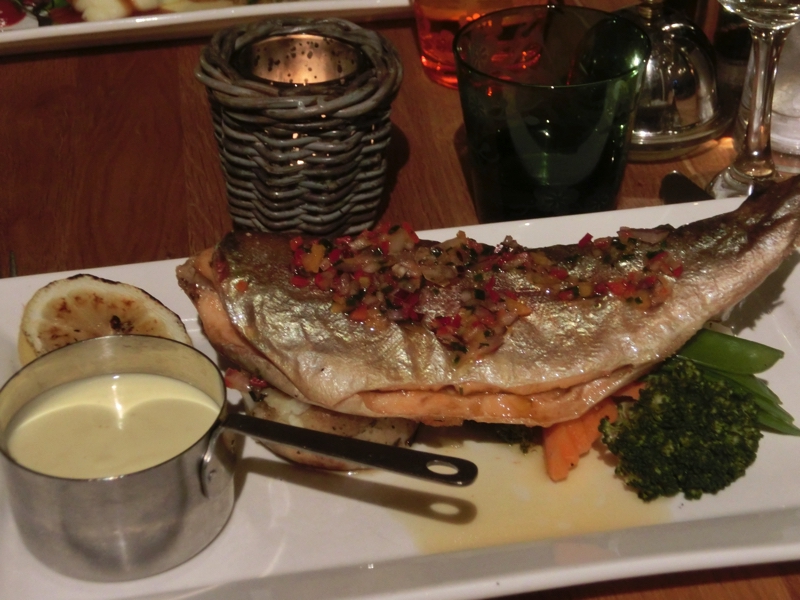 では何にしましょうか。ワインはトーレスの白をいただき、前菜とメインをそれぞれオーダー、楽しみだな。しばらくして前菜登場。一つはスープ、緑色をしたポタージュだ。豆の味がしっかりする、おいしいスープ。もう一つはバイブリー名産のマス。スモークやマリネなどいろんな食べ方があり、付け合せの野菜と合わせながらいただく。しっかりしたマスの味がおいしいです。そしてメイン、一つはマス。頭は取ってあるが、マス一匹のグリルはなかなかのボリューム。ジューシーな身だが脂は控えめのさっぱりした味わいでおいしい。もう一つは牛肉、肉自体は小ぶりだが、ミートローフのようなものもあり、たくさんのグリル野菜とともにこちらもなかなかのボリュームで、赤身のお肉がいい感じ。どちらもほぼ完食して、もう超満腹。