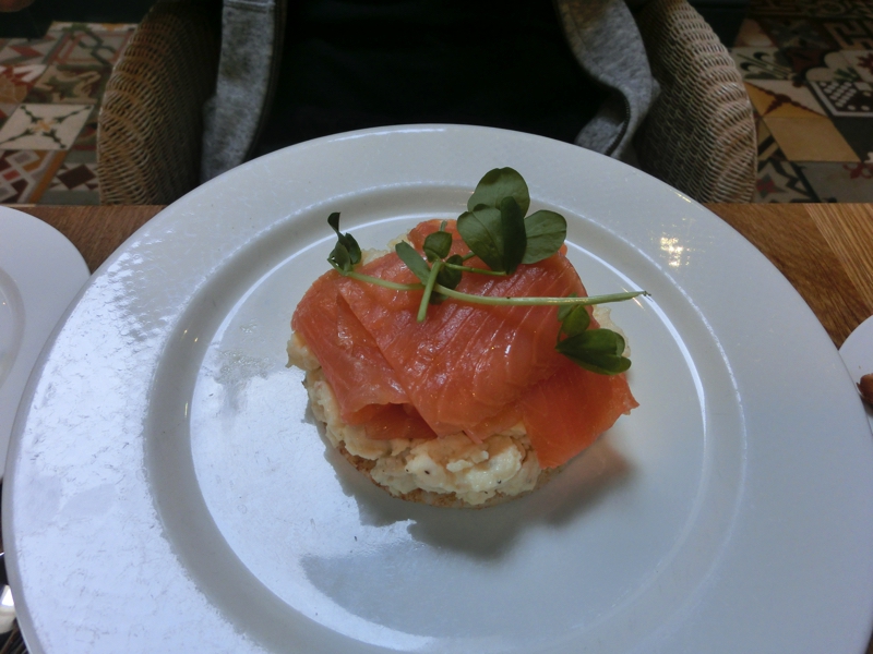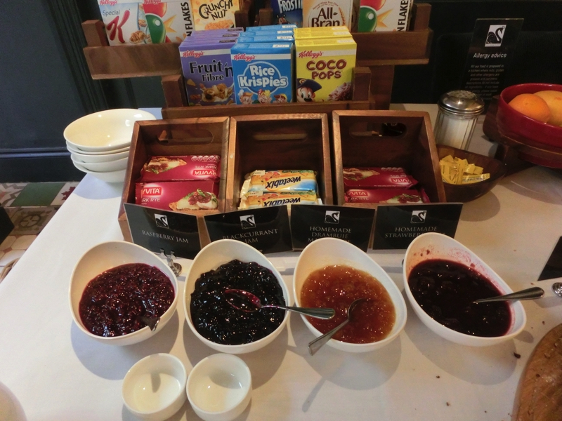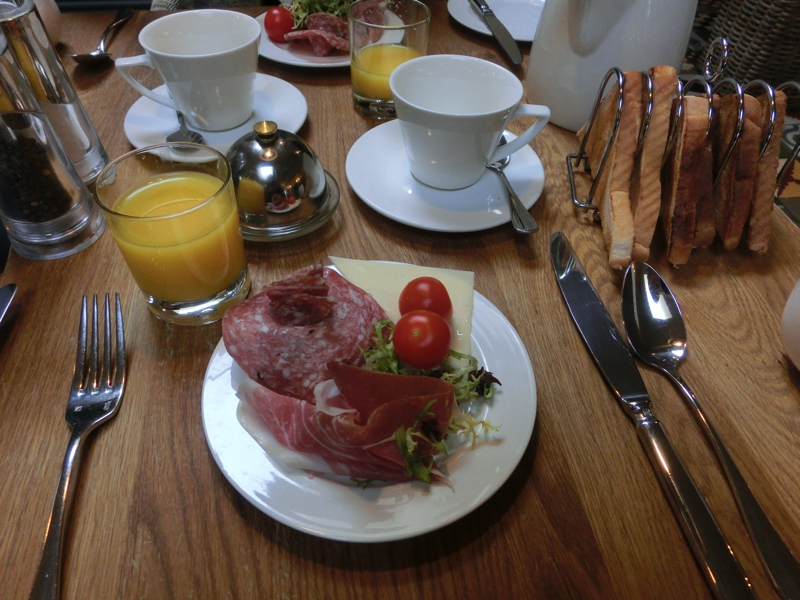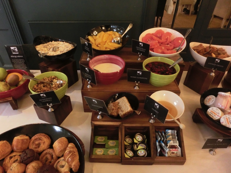 ここの朝ごはんは、冷菜やパンはビュッフェ方式だが、温かい料理はメニューから頼む。フレッシュオレンジジュースやハム、チーズなどを楽しんでいると、温かい料理がきました。一つはスモークサーモンとマスのスクランブルエッグ。これはもう食べおさめだからね。妙に白い卵だが、サーモンやマスの塩気と風味とともにいい感じで味わえる。美味しいですね。もう一つはエッグベネディクト。以前ナパで食べたときはがっつりした感じだったが、ここのはシンプルにハムと卵に黄色いソース。美味しいです。いわゆるイングリッシュブレックファストとは違うが、こういうのもいいな。あとは自家製のジャムや濃厚なはちみつなどを頂きながら、朝から満腹。ごちそうさまでした。