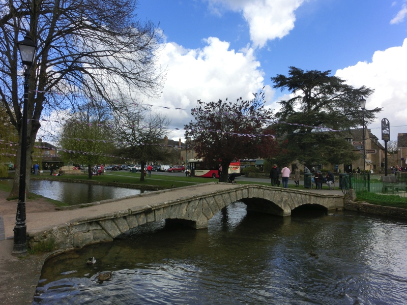 30分ほどで目的地に到着、芝生が広がる駐車場に止める(3)。街にいくと、たくさんの観光客がいて、散策やカフェを楽しんでいるようだ。ここの中心には小川が流れていて、たくさんのカモがいる。ゆったりした流れの中、いろんな動きをするカモを見るのが楽しいし、石造りの小さな橋やたくさんのユニオンジャックがこの街の雰囲気を作っているようだ。煉瓦造りのお店が並んでいて、ウインドーショッピングをしながらぶらぶら歩く。ここはこうした散策が楽しい街だ。日差しが差すタイミングで写真を撮りながら歩き、すこし川を離れてみるとそこもまたいい雰囲気。気持ちのいいところだなあ。