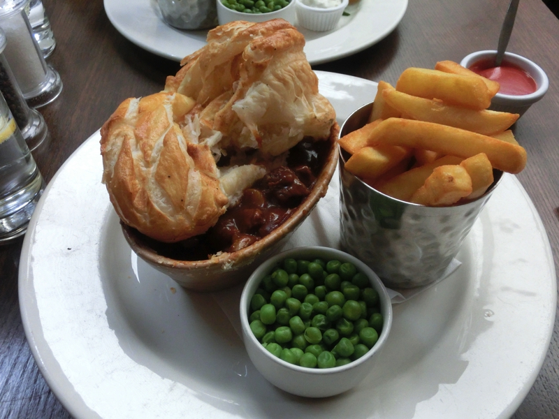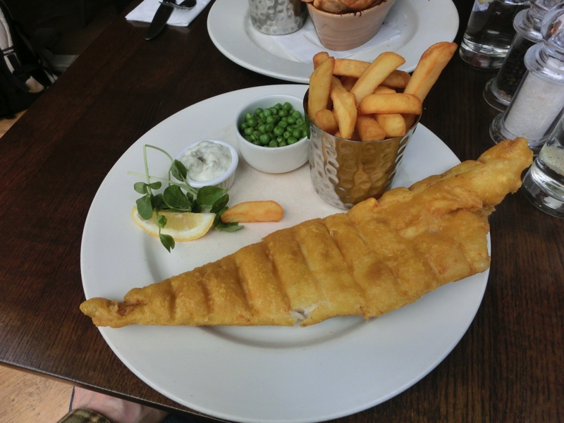 ここバーフォードは斜面の街。大通りの両側にはたくさんのお店があり、その中のパブ、マーメイドへと入る。奥の明るい席に着き、ここで頼むのはステーキパイとフィッシュアンドチップス。いかにもイギリス的な2品だ。泡入りの水で喉を潤し、しばらくして巨大な皿が運ばれてきました。ステーキパイはサイコロ状のお肉がたくさん入ったビーフシチューのようなもので、それがパイで包まれている。フィッシュアンドチップスは巨大な白身魚のフィレがかりっとした衣に包まれていて、レモンやタルタルソースでいただく。どちらもかなりの量だが、このくらいならば食べられる。昨日のアフタヌーンティーのように気持ちがいっぱいにはならないし、チップスにつけるケチャップが酸味があって美味しいので食が進む。ともに完食、ごちそうさまでした。これだけ食べれば、夜は軽くでいいだろうな(30.45)。
