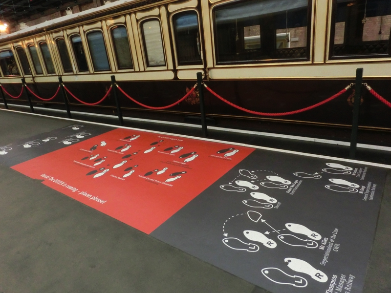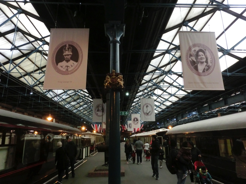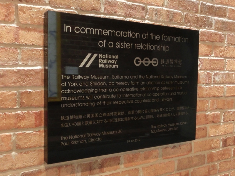 この横にあるのがギャラリー、今はフライングスコッツマン推しのようで、昔の旅行のポスターやそのころのモノクロ映像などが展示されている。日本はこのイギリスに習ってきたところも多くあるわけで、何か感じるところがある。ギャラリーを出たところの通路に黒いレリーフがあり、よく見ると埼玉の交通博物館との姉妹提携を示すもの。日本も鉄道の皇室との歴史があるわけで、お互いを尊重して協力できればすばらしいな。