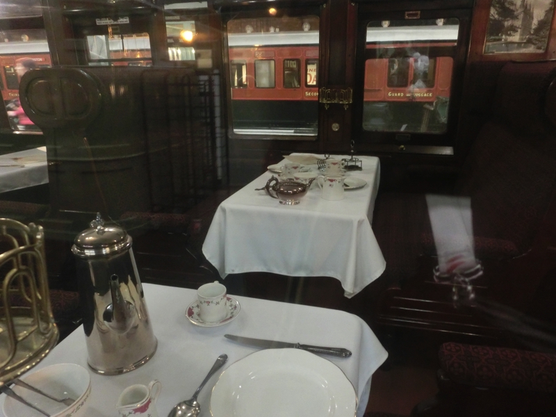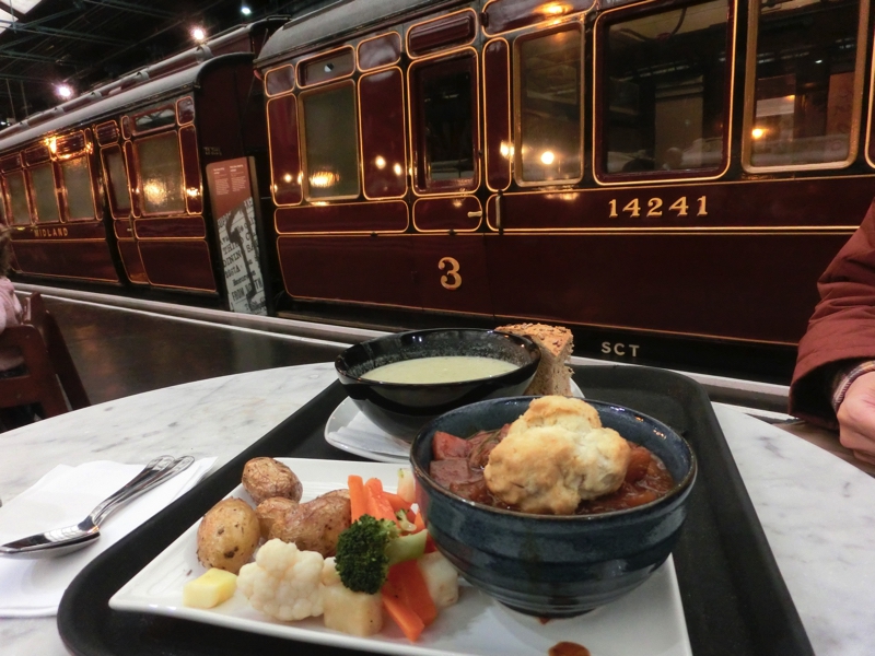 お腹がすいてきた。Station Hallの方にダイニングエリアがあったので行ってみる。車両と車両の間にビュッフェがあり、ここでいただきましょう。スープとビーフをいただくと、予想通りどちらもたっぷり。スープはブロッコリーのようで、クリーミーでおいしいです。ビーフは柔らかく煮込まれていて、付け合せの野菜とともに美味しくいただきました。こうしたイギリスごはんも、量さえ注意すればおいしくいただけますね。ごちそうさまでした(10.95)。