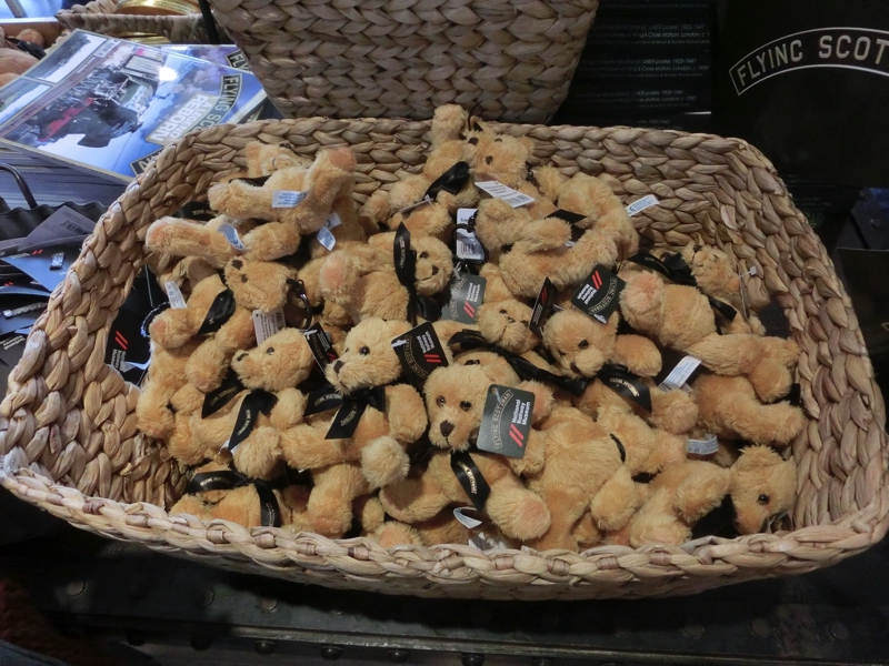 倉庫を抜けると展望デッキがあり、ヨーク駅を発着する列車を見ることができる。ちょうどニューキャッスル行きの列車が通るので見ることができました。さあ、これで一通り見たかな。もう一度新幹線をしっかり見ておきましょう。あとはおみやげ屋さんで記念品。小さなテディベアのキーチェーンがいい感じなので、いい顔しているのを選んでゲット(6)。鉄道博物館、満喫しました。