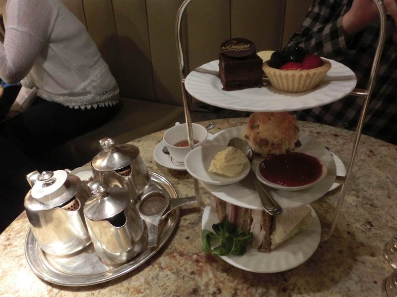 さて、どうやら街をぐるっと歩いたようで、Betty’sのところまで戻ってきた。行列は相変わらず10組ほどあるが、そろそろ並びますか。お店は広いので、それなりに進んでいく。中の様子が見えるが、みんな何を食べてるんだろうな。アフタヌーンティをシェアしているテーブルもあるようなので、そんな感じでちょうどいいかもね。しばらくして、順番がきた。地下にある席へと案内され、割と広くてここもいい感じだね。さあ、ではアフタヌーンティをひとつ、紅茶はBetty’sのブレンドを頼み、もうひとつはアールグレー。これで十分でしょう。まずは紅茶がきた。どちらもおいしいが、やっぱりアールグレイはベルガモットの香りが特徴的。そしてアフタヌーンティのお皿がきたのだが、これでちょうどいい量かな。サンドイッチもいろいろあっておいしいし、スコーンも半分でちょうどいい。そしてこのスコーンと食べるジャム、こういう味とアールグレイがとてもよく合うことを発見。あとはレモン風味のマカロン、これもアールグレイに実によく会う。チョコケーキはBetty’sブレンドの方が合うかな。こういう発見も楽しいものです。