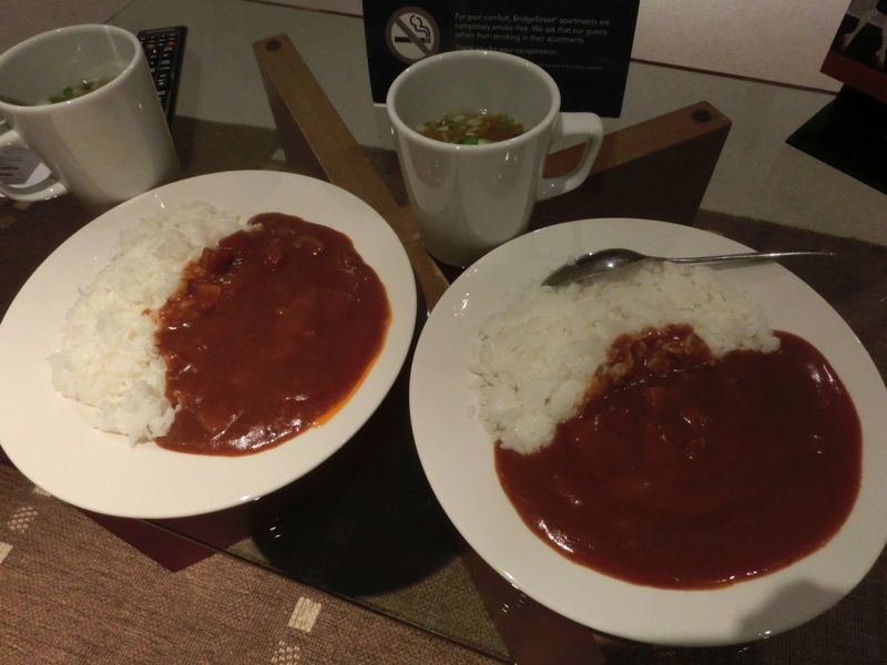 今日は朝昼ちゃんと食べたし、アフタヌーンティもしてビールも飲んだので、晩ごはんは軽めにしようということで持参したカレー。やっぱり部屋でボイルできるのは便利だな。ちゃんと皿もあるので盛り付けもばっちり、味噌汁とともに美味しくいただく。いやあ、最高だなあ。ごちそうさまでした。