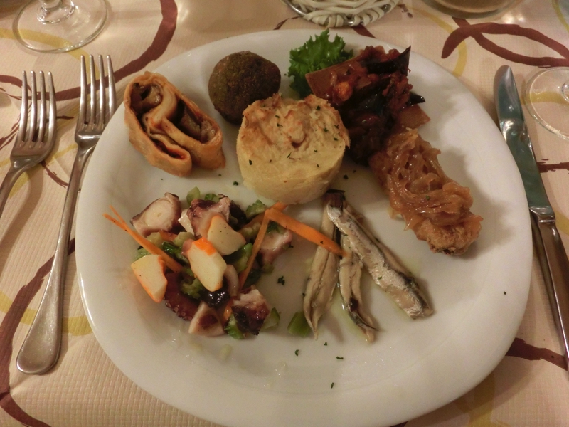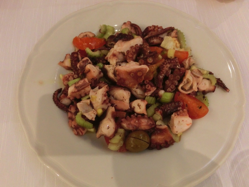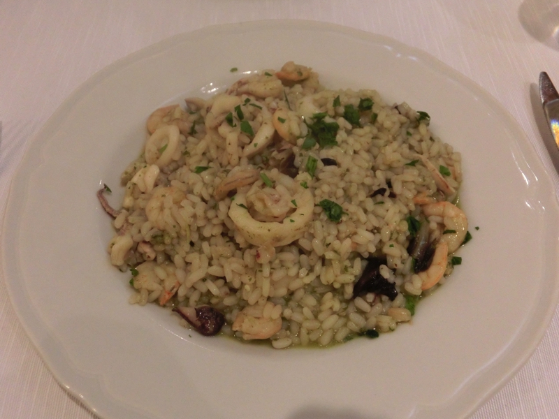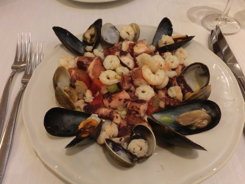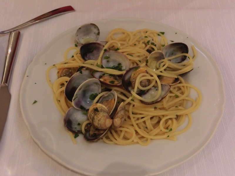 石段を降りて海に到着。港には小型の船がたくさん泊まっている。この近くにあるのがTrattoria Al Faro、ここはネットでも見ていたお店なので、入ってみましょうか。ここまであまりお店がなかったせいか、多くの人で賑わっているがちょうど空いているテーブルがありました。さて、何にしましょうか。メニューには魚介中心に美味しそうなものがたくさんある。でもここはやっぱり前菜にはタコや魚介のサラダかな。たっぷりのシーフードをハウスワインとともにおいしくいただく。このくらいの量を食べられると満足しますね。そしてもう一品はリゾットとボンゴレ、リゾットはシーフードたっぷりだしボンゴレはアサリたっぷりだし、海の近くの雰囲気もあってとてもおいしい。ごちそうさまでした(40)。