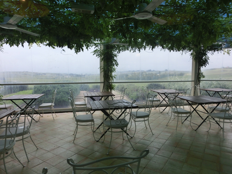 部屋に戻って少し休憩。荷造りして、そろそろ行きますか。外に出ると、少し天気もましになったかな。フロントへ行き、チェックアウト(678)。丘から眺めるこの景色も見納めなので名残惜しいな。分かっていつつも何枚も同じような写真を撮り、自分たちが入る写真も撮ってもらう。いろいろとお世話になりました。そろそろ行きますか。