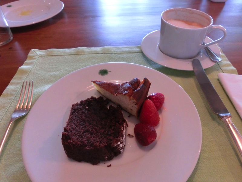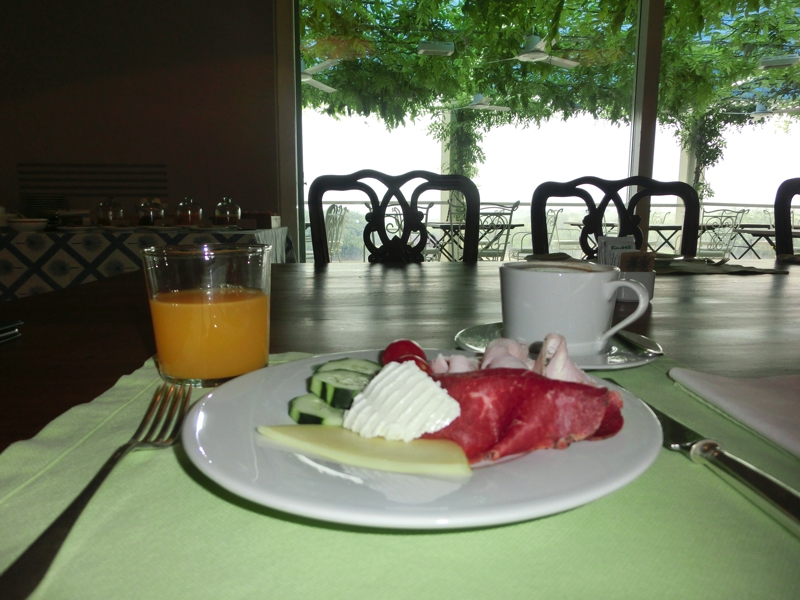 8時過ぎに朝ごはんへ。昨日と同じく、外の席は使えない状態。まだ天気が今ひとつだから仕方ないかな。ハムやチーズ、キュウリやトマトなどをいただき、フルーツやケーキなどもいただきましょう。カプチーノとともに、ちょうどいい感じ。昨日も思ったが、やはりここは泊まっている人がそれなりの年齢の人が多い。子連れや若者同士があまりいないのもこういう場所の特徴かな。落ちついた、いいホテルでした。