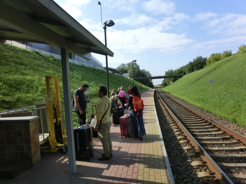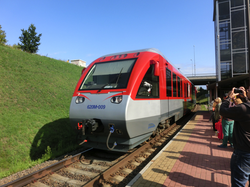 ヴィリニュス空港のターミナルは、空港というよりも駅のような雰囲気。到着ロビーから電車に乗り継ぐために外に出るが、ターミナルビルがまるでヴィリニュス中央駅のようだ。うっすら晴れていて涼しいという最高の気候の中、空港駅まで歩く。小さな駅にはすでに旅行客が電車を待っているが、1時間に一本あるかないかとのことなので結構少ないのね。ちょうど15分後くらいに来るのでタイミングはよかった。しばらくして電車が到着。2両編成の赤いかわいい電車だが、ホームとの高低差がかなりありステップが出てくる。