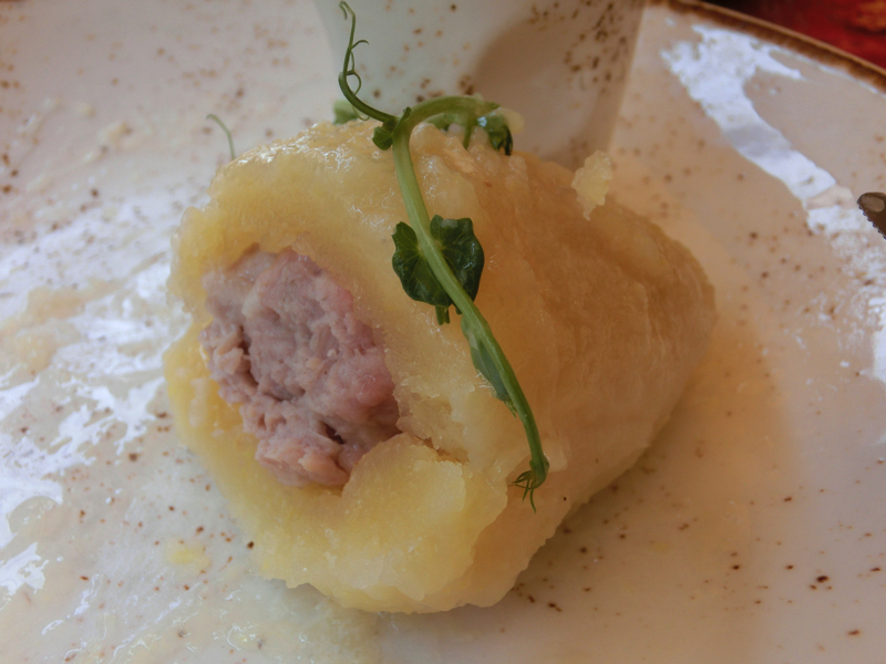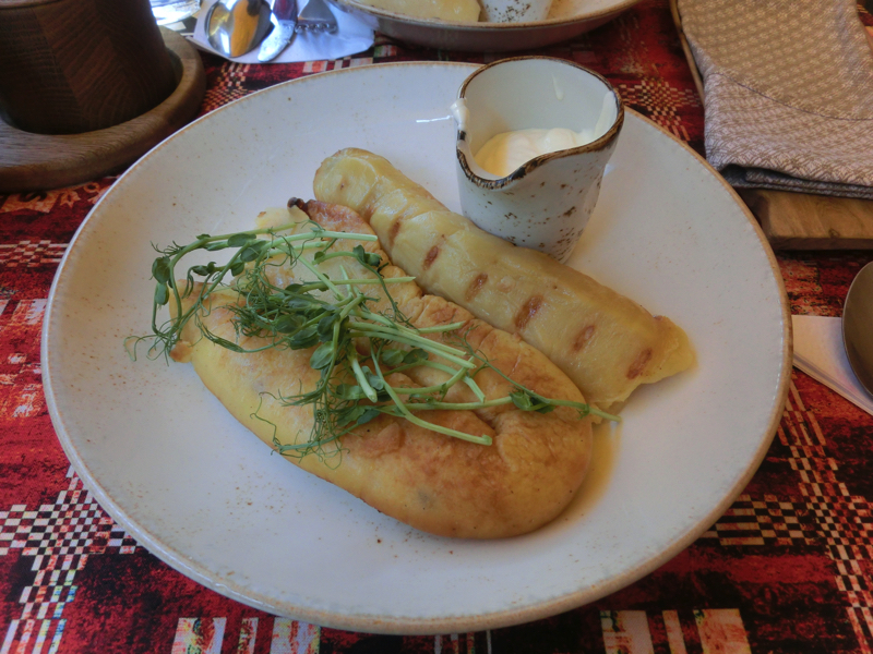 なかなか毒々しいピンク色だが、これはビーツの自然な色。味としては少し酸味があってさわやか、細かく刻まれたビーツやキュウリがおいしい。付け合わせのポテトとともに、前菜としてはいい感じです。ただ、ひとり一個だったら多かっただろうな。そしてメインが登場、まずはポテトのソーセージ。マッシュポテトが入ったソーセージとの紹介だったので、太めのソーセージの中にマッシュポテトが挟まっているようなものを想像したらこれがマッシュポテトオンリー。要するに腸詰の詰め物が肉ではなくマッシュポテトなのだ。なのでナイフで切ったり口で噛んだりするとソーセージのパリっとした感があるのだが、中身がポテト。なるほど〜素朴な郷土料理としておいしいが、これも一人で一皿となると厳しいかな・・・もう一つはツェペリナイというジャガイモ団子のようなもの。こちらは中に肉があり、つるっとしたジャガイモの食感とともにおいしくいただける。とはいえこれも一皿で2個あるので、一人一皿は厳しいな・・・リトアニアの素朴な郷土料理は、おいしいが量が多くて半分づつで心もお腹も大満足、ということで(21)。