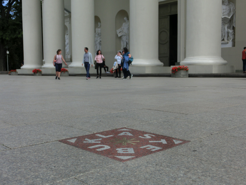 少し歩くと、大聖堂広場に到着。ここは13世紀に十字軍の侵略を防ぐために建立されたものとのこと。少し雨が降ってきたこともあり中に入ると、太い柱にそれぞれ大きな聖人の絵が飾られている。少し気が引き締まる感じがします。雨が上がったので外に出ると、大聖堂広場の真ん中あたりにちょっと色の違うところを見つけた。ここは1989年にバルト三国がソ連から独立を求めるためにヴィリニュス〜リガ〜タリンを結ぶ「人間の鎖」を作った時に、ヴィリニュス側の起点となった場所。ここには「奇跡(stebukals)」と書かれており、この上で3回転すると願いが叶うそうです。あと広場に建つのがケディミナス像、なんでもヴィリニュスの街の基礎を気づいた人物だそうで。