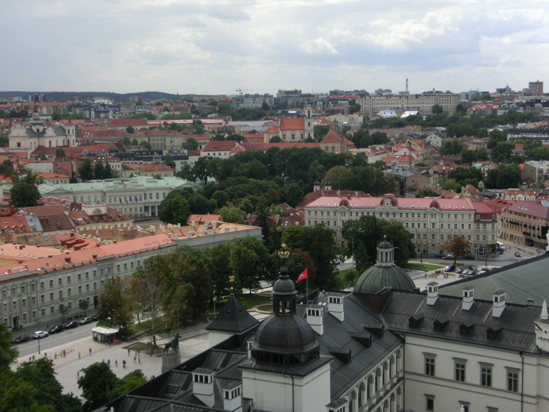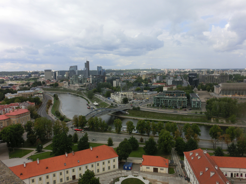 狭いらせん階段を上って屋上に到着、ここからは360度街の景色を見ることができる。すぐ近くに見えるネリス川の流れや遠くに見えるテレビ塔も印象的だが、やっぱりこの旧市街の街並みが美しい。よく見ると、たくさんの教会が見えるがどれもそれぞれ個性があるし、キリスト教だけではなくイスラム教のモスクも見える。さまざまな歴史がこの街を作っていることが感じられる。風が強く吹いているのでリトアニアの国旗がはためいているのがいい感じ。