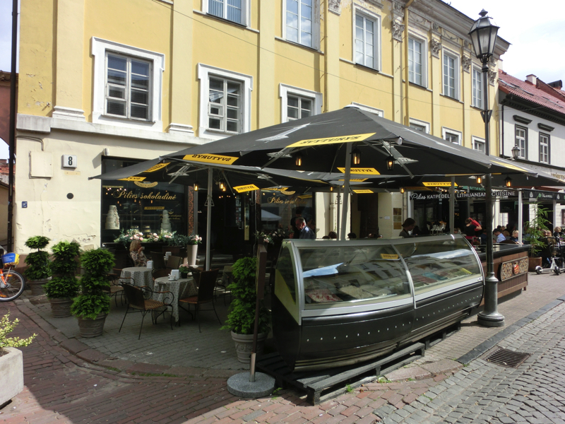 市庁舎前広場に到着。ここにあるのは実際には旧市庁舎で、18世紀の建物。現在はコンサートや展覧会などが行われているらしい。その前の広場はヴィリニュス旧市街のちょうど中心にある場所だ。このあたりからは道沿いのお店も増えてくる。聖ヨハネ教会やビリニュス大学を超えて到着したのが今日の昼ごはん場所、フォルト・ドゥヴァラス。