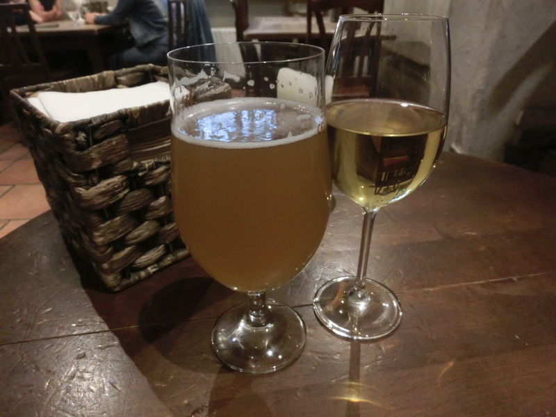 ちょうど日本人と席の入れ替わりをした感じで、少し奥の席にも日本人の団体がいる。ある程度お年を召した、旅慣れている感じの人が多いようだ。昼がマッシュポテト三昧だったので夜は肉を食べたい、ということで豚と羊のメニューをそれぞれ選ぶ。まずはリトアニアの地ビールと、名産のアップルワインで乾杯だ。その後お肉の一皿が登場。どちらもフライドポテトはたっぷりついているが、野菜のグリルやピクルスなどもありバランスはOK。羊も豚もしっかり食べ応えのある量だし、ちゃんとおいしい。昼と夜でリトアニアの料理をいろいろと満喫したな。