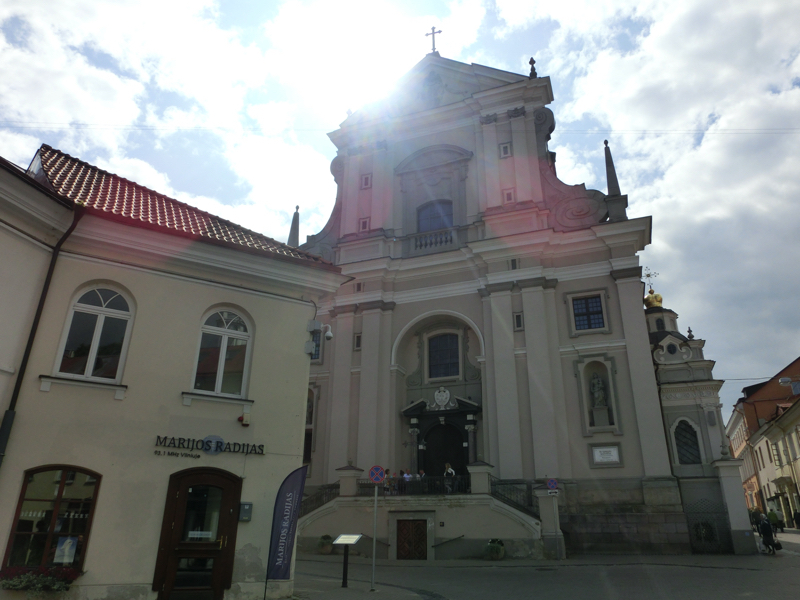 先へ進むと、聖三位一体教会の門の向かいにそびているのが聖カジミエル教会、ここはリトアニアの守護聖人を祀っているとのこと。正面から見るとサーモンピンクの壁が印象的だが、少し離れてみると最も高い塔の屋根が王冠をかぶったようになっているのが印象的。ソ連時代には博物館になったこともあったらしい。