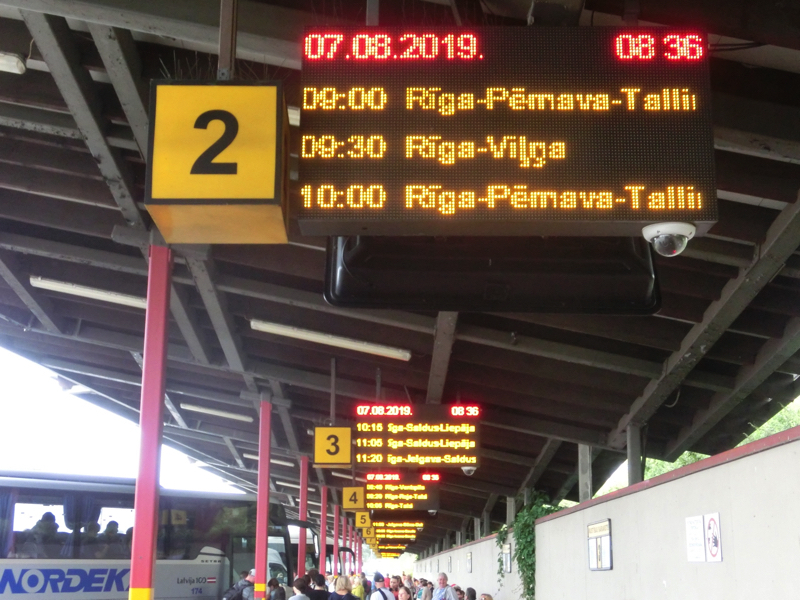 ジュースがいまいちと思っていたが、黄色っぽいのが梅のようでおいしい。これがアップルジュース、ラトビアのリンゴは相当酸味が強いのかな。食後にはコーヒーとシナモンロール、北欧らしい組み合わせがおいしい。30分くらいだったがいろいろいただきました。部屋に戻り、8時20分頃にホテルをチェックアウト(241.38)。今日は曇り空。バスターミナルまでは地下道をくぐるとすぐ、便利だな。カウナスに比べると、クラシカルな雰囲気のある建物だ。2番乗り場に行くと、ほどなくバスが到着。