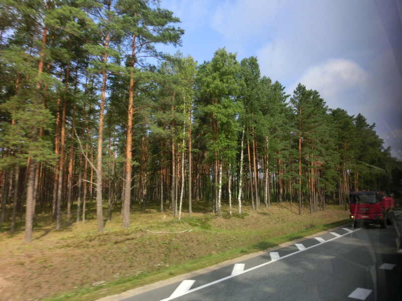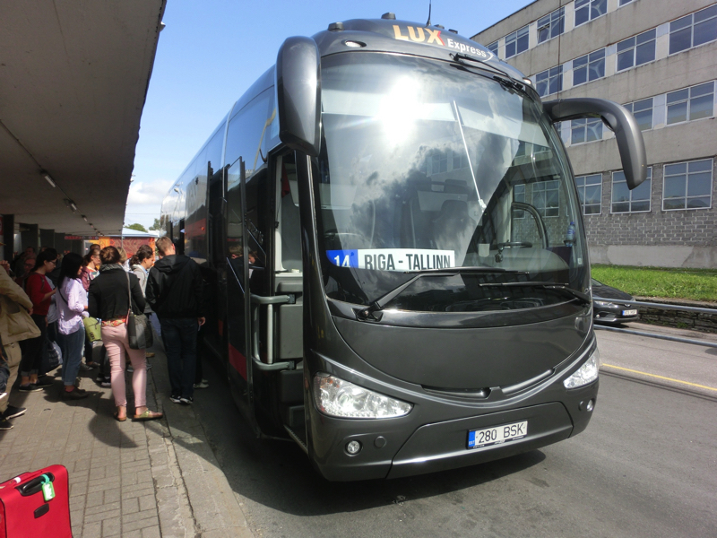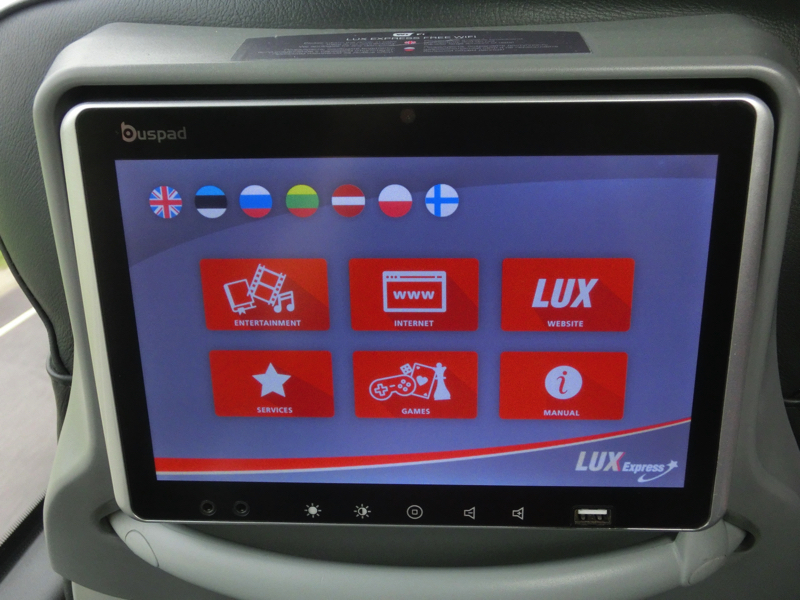 今日はLuxという会社で、こちらは荷物に受付順のシールを貼ってくれる。座席は一番後ろだが、わりとゆったりとしている。個人モニタもあるし、トイレもついているので途中休憩もないかもね。バスは定刻の9時となり、出発だ。さっきまでいたホテル前を通っていく。このあとしばらくは寝ていたが、幹線道路に入るまで1時間ほどかかったかもしれない。バスはタリンに向けて走っていくが、昨日のようにガンガン抜かしたりはしないようで安全運転。これはよかった。