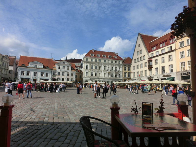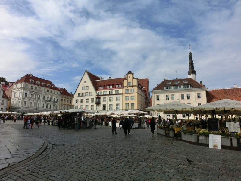 ラエコヤ広場の入り口にあるのが聖霊教会。ここは14世紀に建立された、タリン最古の教会。さて、広場に戻ってきたぞ。まだまだにぎやかで、ここでちょっとカフェタイム。広場に面した席で、カフェオレを楽しみましょうか(10.5)。しばらくすると広場の屋台が営業終了で片付けられ、市庁舎がよく見えるようになりました。こうなると意外に広く感じる。ここでクリスマスマーケットも行われるのかな。
