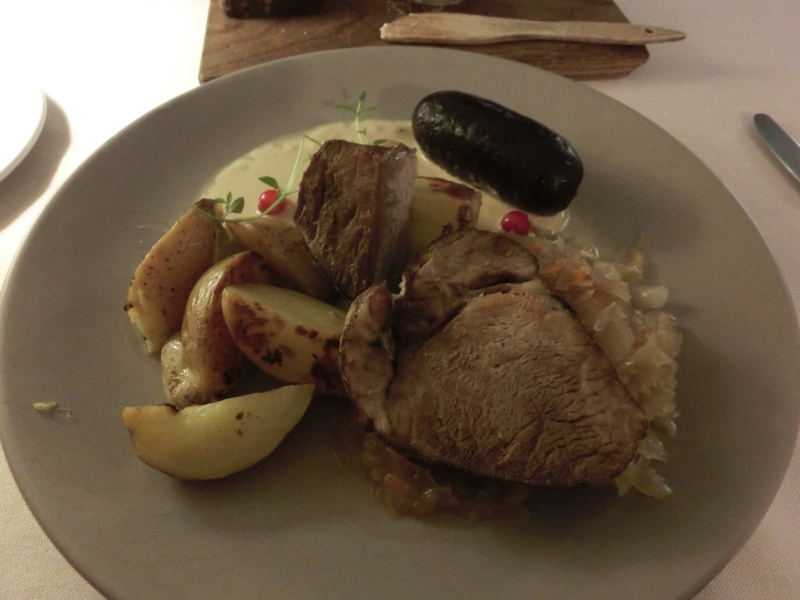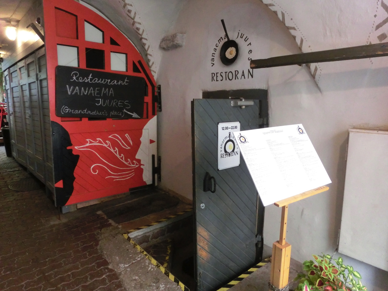 この広場を抜け、少し歩いたところのVanaema Juuresに到着。地下にあるレストランで、この中途半端な時間でもお客さんが入っている。ここで食べたいのはローストポーク、まずはエストニアのダークビールとシードルで乾杯だ。そして出てきたのが黒パン、これがしっとりした食感と自然な甘みが実に美味。ビールともよく合う。バターなしでもしっかり味わえるね。日本ではあまり食べる機会はない黒パンだが、やっぱり本場はうまいなあ。しばらくして、ローストポークが登場。肉厚な豚肉はやわらかく、付け合わせのザワークラフトの甘みとマスタードの酸味がいい感じ。噛むとほぐれるような触感がいいですね。黒いソーセージは豚の血入りだが、あっさりとしてくせがなく食べやすい。いやあ、どれもおいしかったです。ごちそうさまでした(38.6)。
