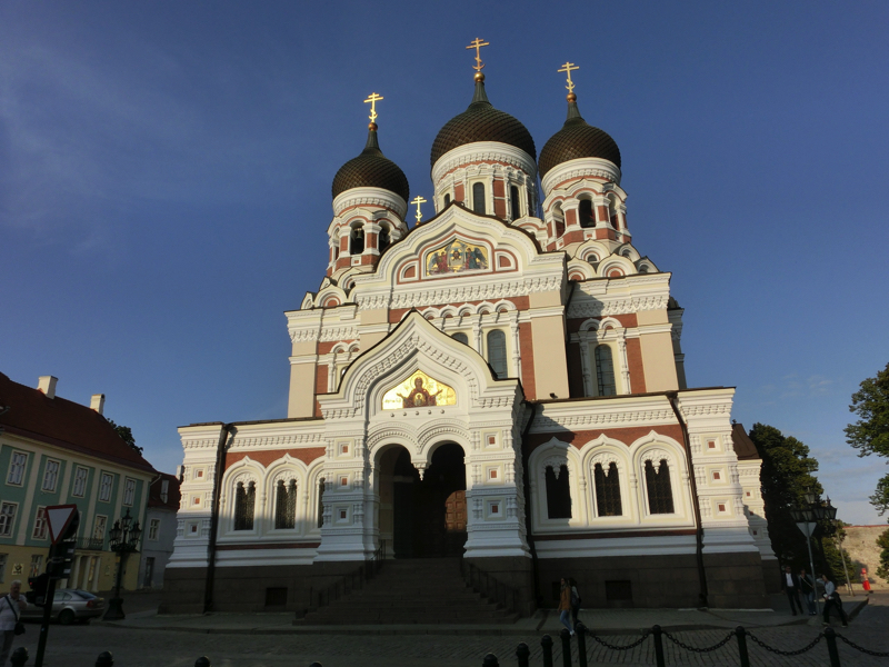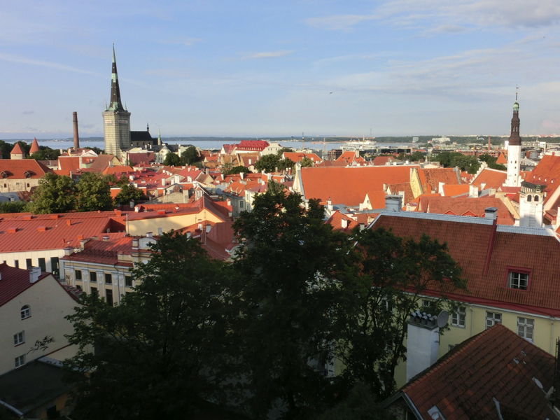 それにしても、いい天気になってきた。もはや快晴といってもいいくらい。今の時間帯なら、展望台からの景色がきれいだと思われるので歩きましょう。まだお腹もいっぱいだしね。カフェを出て、迷路のような通りを歩いていく。聖ニコラス教会を過ぎ、このあたりからは狭い上り坂。その登りきったところにあるのがアレクサンドル・ネフスキー聖堂。ロシア風の屋根がかわいらしい。さらに進み、大聖堂のわき道を抜けるとそこはコフトウッツァ展望台。ここからは、赤い切り妻屋根の建物や教会の尖塔、そしてバルト海までもが一望できる。ちょうど傾きかけた太陽の光が屋根にあたっており、とてもきれいな景色だ。今日は雨予報だったはずなのに、いい感じに天気予報は外れてくれるものです。